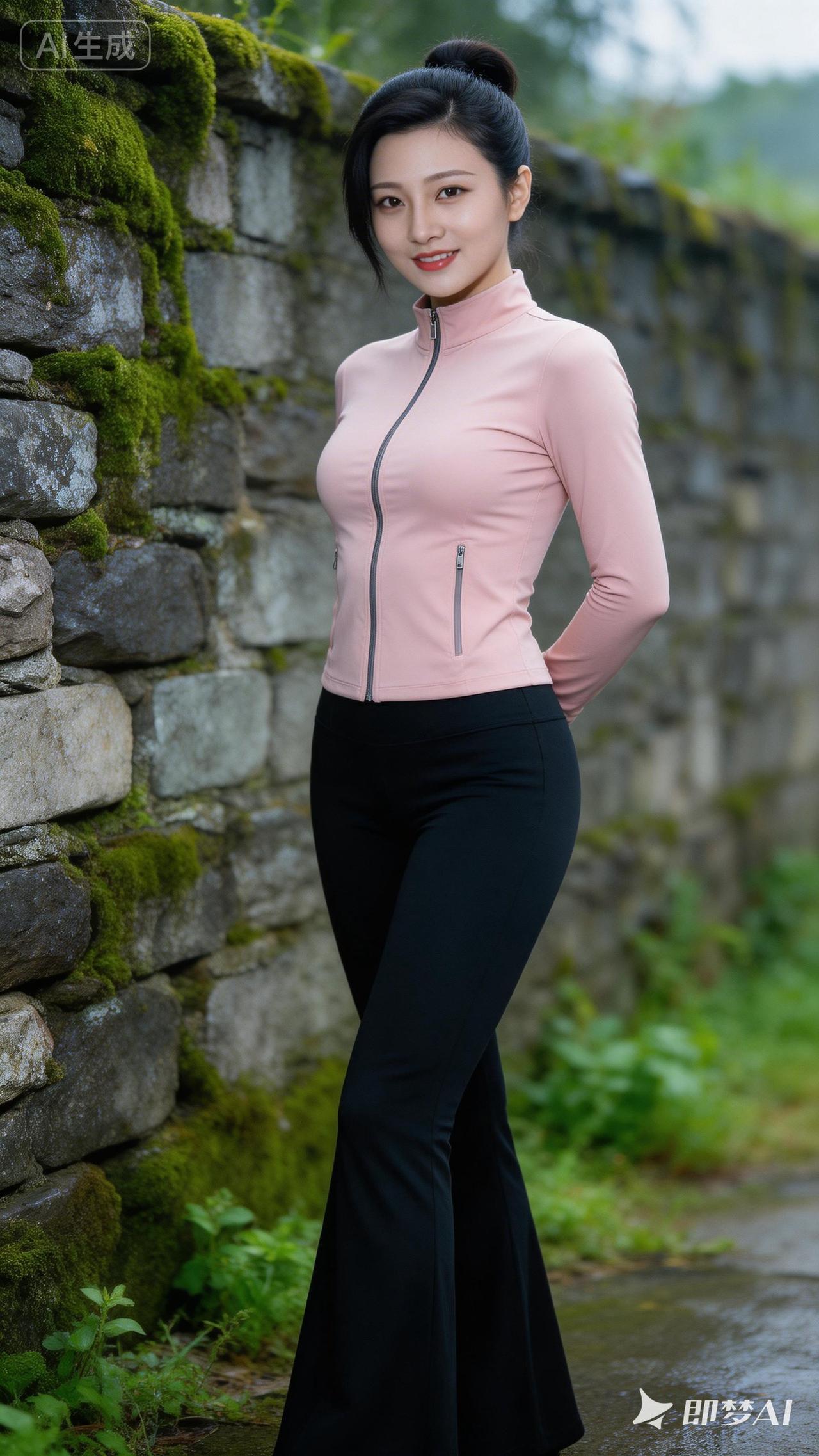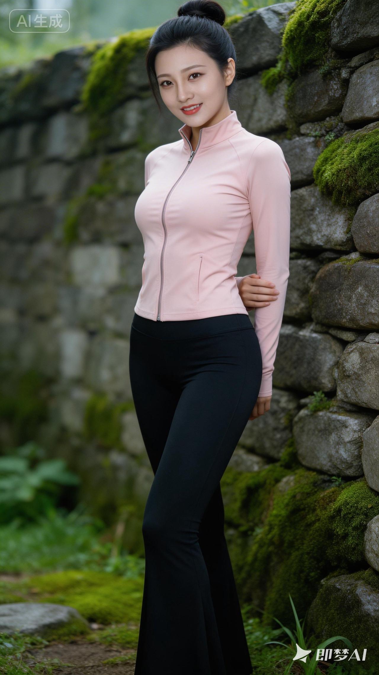 户外运动穿搭指南,粉色运动上衣搭配黑色长裤,活力满满!