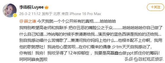 薛之谦前女友又爆料,说薛之谦出轨抠门,还说要一个个公开真相引群嘲。 网友们已经审美疲劳了,这些陈年旧瓜一点都不吸引人,薛之谦和前妻高鑫磊已经复婚多年,两人感情稳定。 网友分析李雨桐应该是缺钱了,缺钱就去搞钱,在网上撒泼打滚只会惹人烦。 感觉薛之谦都懒得回应她了,马上就快到薛之谦的演唱会,李雨桐这样一闹,就是不想让他好过。 老薛从来没有立过深情专一人设,十几年前的挂翻来覆去的说,我耳朵都起茧子了,更别提老薛,老薛应该庆幸早点离开了她,要感谢她的不嫁之恩。