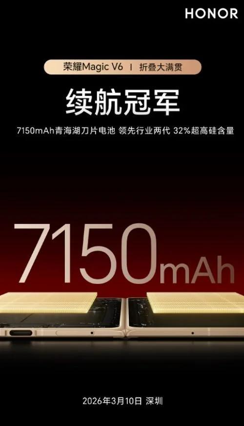 折叠屏用户最大的痛是什么?是价格?No,是续航。一天两充三充,带出门像背了个充电宝。此次荣耀Magic V6直接甩出7150mAh青海湖电池,这数字放在直板机都炸裂,更别说塞在折叠屏里。行业喊了多年的轻薄与续航不可兼得,被荣耀用硅含量32%的刀片电池技术撕碎了。985Wh/L能量密度,车规级看了都沉默。219g重量,8.75mm厚度,这手感跟直板旗舰没差。别家还在6000mAh打转,荣耀直接开启7000mAh时代,这不是升级,是降维打击。3月10日发布,折叠屏市场要变天了。荣耀Magic V6