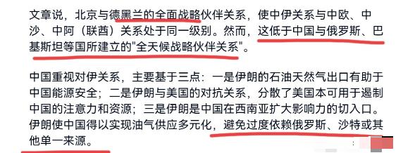 德媒这一次倒是难得的说了实话!德媒表示,中伊关系并不是盟友关系,在北京看来,打击伊朗更像是美国惹出的麻烦!3月2日,德国之声刊文表示,中国在伊朗有相当大的利益,但这些利益并非生死攸关,甚至都算不上举足轻重。北京与德黑兰的全面战略伙伴关系,这让中伊关系与中欧、中沙、中阿(联酋)关系只是处于同一级别。 然而,必须承认这低于中国与俄罗斯、巴基斯坦等国所建立的"全天候战略伙伴关系"。 说通俗点,“全天候”就是不管国际风云怎么变,双方都是铁哥们,在核心利益上绝对相互支持,比如中巴之间的“巴铁”情谊,中俄之间的深度协作,都是这种关系的体现。 而全面战略伙伴关系,更像是“深度合作的朋友”,大家在经济、外交等领域互相配合、互利共赢,但不会绑定彼此的军事和核心安全利益,更不会搞“结盟对抗”那一套。 德媒提到,中国和伊朗合作的核心,说白了就两点:一是石油,二是分散美国的注意力。这话说得直白,但确实说到了点子上。 作为全球最大的石油进口国,中国一直以来都在努力实现石油供应多元化,毕竟如果过度依赖某一个国家或地区,一旦出现地缘冲突,能源安全就会被人卡脖子。 而伊朗作为石油出口大国,恰好能成为中国石油供应的重要补充——根据伊朗石油部和中国海关的官方数据,伊朗80%的石油出口都流向中国,这对中国来说,是保障能源稳定的重要一环,但绝非唯一选项,中国还有沙特、俄罗斯等多个石油合作伙伴,所以德媒才说,中国在伊朗的利益“算不上举足轻重”,更不是生死攸关。 至于第二点,分散美国的遏制注意力,其实更像是大国博弈中的“顺势而为”。这些年,美国一直把中国视为主要竞争对手,在亚太地区搞围堵遏制,试图集中资源打压中国发展。 而伊朗作为中东地区的重要国家,一直和美国处于对立状态,美国在中东投入的精力越多,能用来针对中国的资源就越少。 中国和伊朗保持正常的合作关系,不用刻意去对抗美国,就能间接减轻自身的战略压力,这其实是一种非常务实的长期博弈,既不惹麻烦,又能实现自身利益,何乐而不为? 德媒还点出了一个很重要的点:中国向来避免在军事上支持伊朗。这一点,从近期美伊冲突的表态中就能看得清清楚楚。 2月28日,美以联合对伊朗发动军事打击,地区局势急剧升级,中国外交部第一时间呼吁立即停止军事行动,重回对话谈判,反对在国际关系中使用武力,但从未有过任何军事支持伊朗的举动。 中国常驻联合国代表傅聪也在安理会紧急会议上强调,应尊重伊朗的主权和领土完整,通过对话解决分歧,这和德媒所说的“中国将伊朗视为长期博弈,不卷入军事冲突”完全吻合。 其实说到底,德媒这次之所以能说出实话,核心是看清了中国的外交逻辑——中国从不搞结盟,也不搞阵营对抗,所有的合作都是基于互利共赢,一切行动都围绕自身的核心利益展开。 对中国来说,打击伊朗确实是美国自己惹出来的麻烦:是美国率先打破中东的平衡,单方面对伊朗实施制裁、发动打击,最终导致地区局势动荡,这本来就和中国没有关系,中国自然不会替美国收拾烂摊子。 相反,中国会继续保持中立,推动对话谈判,因为中东的和平稳定,才符合中国的长远利益,也符合全球的共同利益。 可能有人会觉得,中国这样做是不是太“佛系”?其实不然,这正是中国外交的高明之处。在复杂的国际博弈中,不盲目站队,不卷入不必要的冲突,专注于自身发展,同时通过务实合作维护自身利益,这才是最稳妥的选择。 德媒这次的解读,虽然立场还是站在西方视角,但至少摆脱了偏见,客观反映了中伊关系的本质,也让更多人看清了中国“不结盟、不对抗、不针对第三方”的外交原则。 信息来源: 中国网(2026年3月1日、2月28日关于中伊关系及美伊冲突的报道)