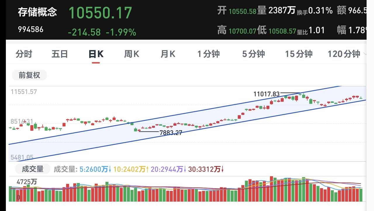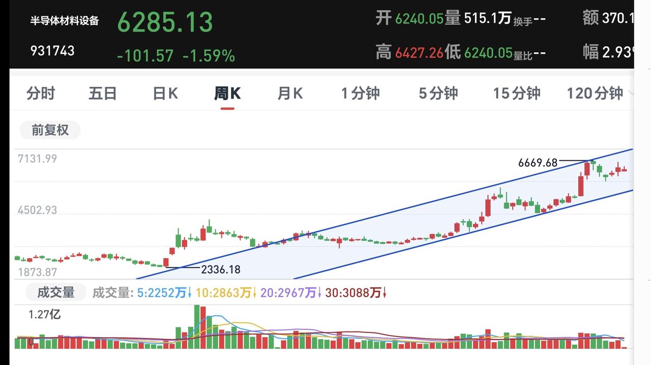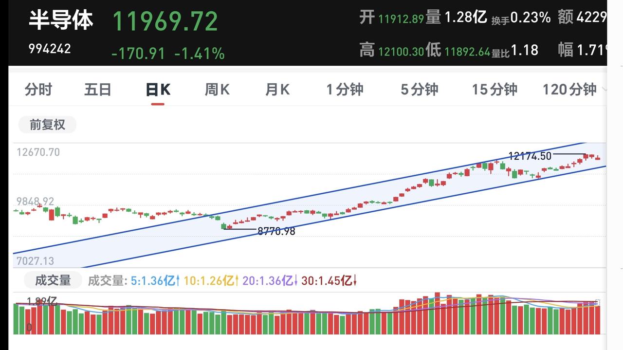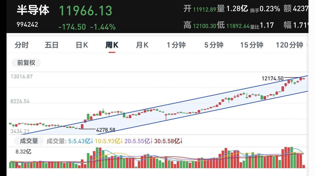 基金:半导体板块、半导体材料设备板块和存储芯片板块 指数冲高以后小幅度回落,创业板指下跌了0.38%,盘中点位3297点,上证指数上涨了0.39%,盘中点位4179点。 黄色线还是在蓝色线下方,两条线之间的长口还是比较大,今天指数创4190点新高的可能性不大,放量滞涨是今天盘面的主要特征。 两市累计成交26611亿,相比于上周五放量了25%,上涨1100多家,下跌4200多家,涨停85家,跌停23家,主力资金净流出818亿,这样的盘面数据与上证指数的上涨很不协调,上证指数的上涨很不正常。 整个市场主力资金净流入最多的三个板块是:通信设备板块,通信板块,军工板块,主力资金净流出最多的三个板块是:国企板块,人工智能板块,蓝筹策略板块。 看下面的截图6,这是今天加仓人数和减仓人数,今天加仓人数为11998870人,今天减仓人数为3826004人,加仓人数超过了减仓人数。 半导体板块现在盘中估值下跌了0.73%,这是连续第2个交易日下跌,持有人数在所有板块当中排名第21位。 半导体板块日线级别处于上涨通道中,距离上涨通道的下轨线稍近一些,短线持有的人可以继续持有,除非跌破这个日线上涨通道的下轨线,才可以考虑要不要止盈出来观望。 半导体板块周线级别也是处于上涨通道中,距离上涨通道的上轨线更近一些,这样的位置也是不建议追涨进场。周线级别上涨通道的下轨线是长线持有者的持有条件,只要不跌破周线级别上涨通道的下轨线,长线持有的人都可以继续持有。 半导体材料设备板块现在盘中估值下跌了1.22%,是连续第2个交易日下跌,持有人数在所有板块当中排名第16位。 半导体材料设备板块日线级别处于上涨趋势中,距离上涨趋势线很近,近期观察会不会下跌跌破这个日线级别的上涨趋势线,如果跌破这条日线级别的上涨趋势线,短线持有的人需要注意风险。 半导体材料设备板块周线级别处于上涨通道中,与上涨通道上下轨的距离差不多远,小幅度的涨跌都改变不了这个板块周线级别的上涨趋势,长线持有的人可以继续持有,周线级别上涨通道的下轨线是长线持有者的持有条件,只要不跌破这个周线级别上涨通道的下轨线,长线持有的人都可以继续持有。 存储芯片板块现在盘中估值下跌了1.65%,也是连续第二个交易日下跌,持有人数在所有板块当中排名第12位。 存储板块日线级别处于上涨通道中,距离上涨通道的下轨线比较近,近期观察会不会下跌跌破这个上涨通道的下轨线,如果跌破这个上涨通道的下轨线,短线持有的人需要注意风险。 存储板块周线级别也是处于上涨通道中,与上涨通道的上轨线更近一些,这样的位置不建议追涨进场,长线持有的人可以继续持有,周线级别上涨通道的下轨线是长线持有者的持有条件。 今天的市场是有惊无险,今天的市场是表面风光,对于后市还是要保持谨慎的态度,保证本金安全是当前最重要的事件,今天究竟应该怎么办?我会在评论区留言。 花1秒钟点赞,花30秒钟评论,就是对我最大的支持,谢谢大家的支持。