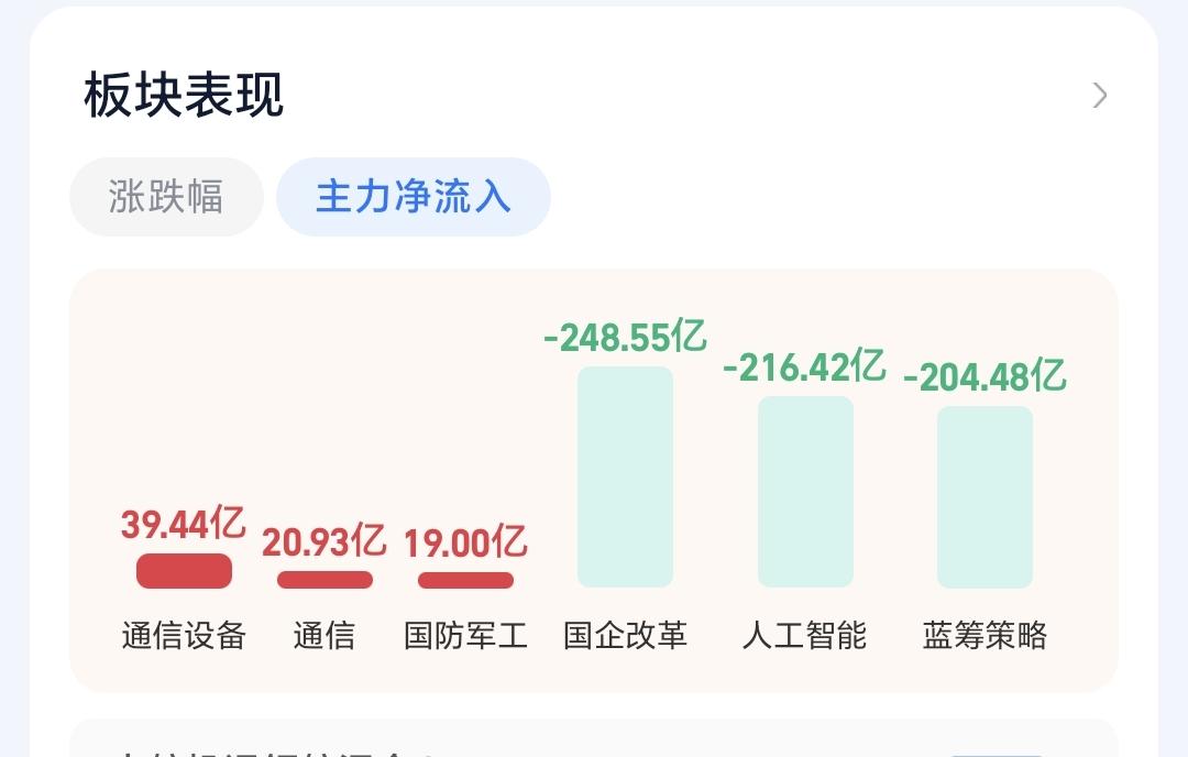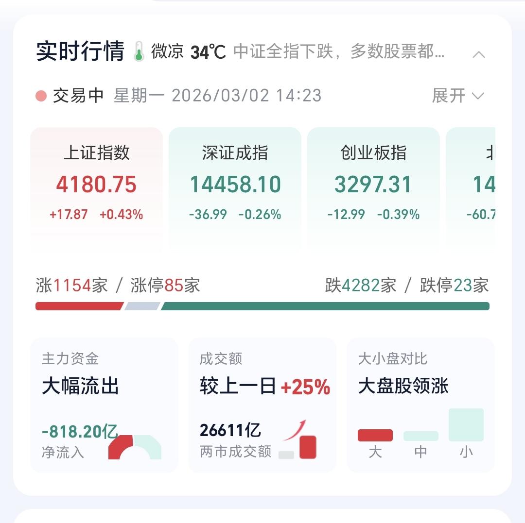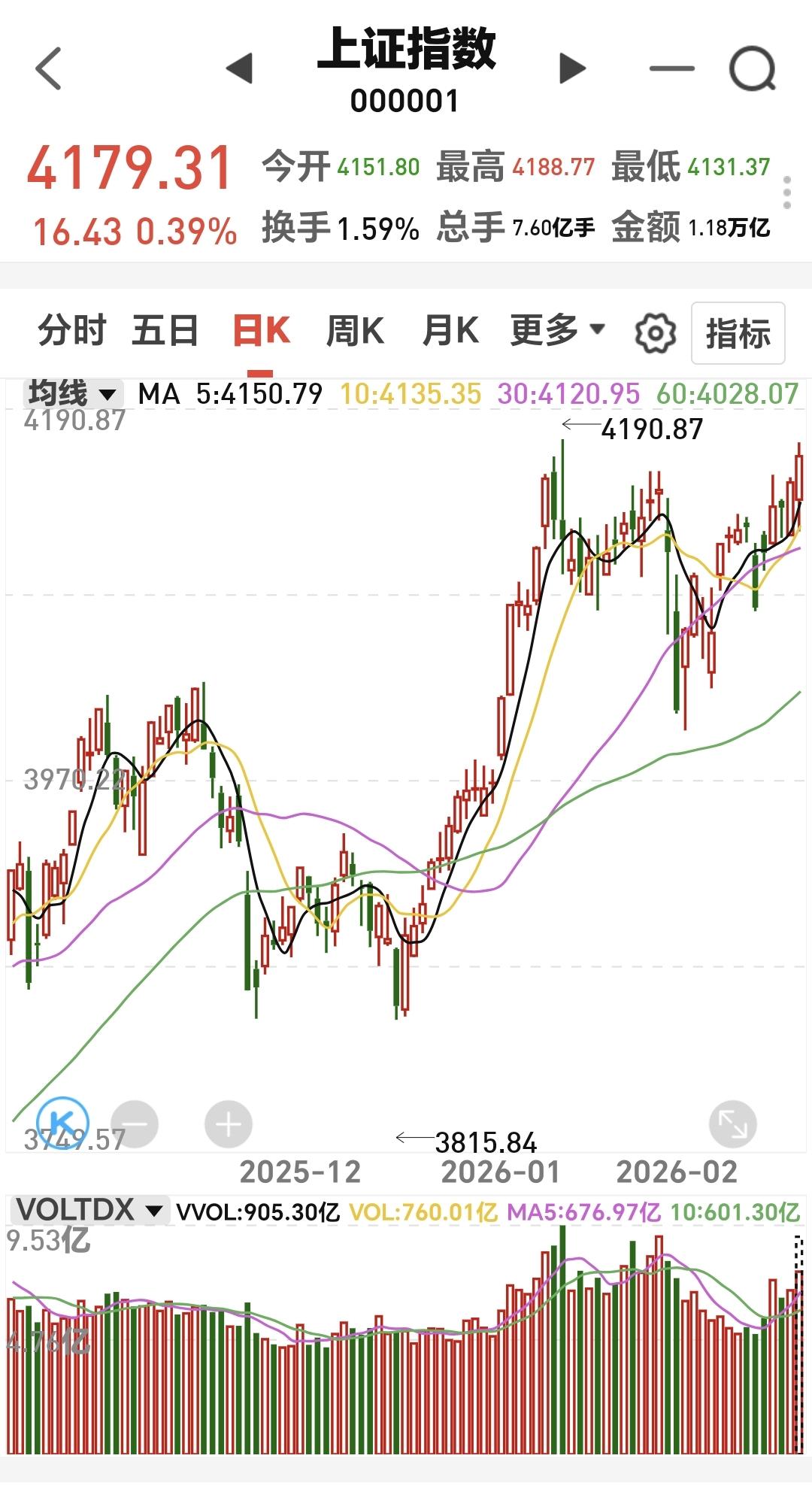 基金:半导体板块、半导体材料设备板块和存储芯片板块 指数冲高以后小幅度回落,创业板指下跌了0.38%,盘中点位3297点,上证指数上涨了0.39%,盘中点位4179点。 黄色线还是在蓝色线下方,两条线之间的长口还是比较大,今天指数创4190点新高的可能性不大,放量滞涨是今天盘面的主要特征。 两市累计成交26611亿,相比于上周五放量了25%,上涨1100多家,下跌4200多家,涨停85家,跌停23家,主力资金净流出818亿,这样的盘面数据与上证指数的上涨很不协调,上证指数的上涨很不正常。 整个市场主力资金净流入最多的三个板块是:通信设备板块,通信板块,军工板块,主力资金净流出最多的三个板块是:国企板块,人工智能板块,蓝筹策略板块。 看下面的截图6,这是今天加仓人数和减仓人数,今天加仓人数为11998870人,今天减仓人数为3826004人,加仓人数超过了减仓人数。 半导体板块现在盘中估值下跌了0.73%,这是连续第2个交易日下跌,持有人数在所有板块当中排名第21位。 半导体板块日线级别处于上涨通道中,距离上涨通道的下轨线稍近一些,短线持有的人可以继续持有,除非跌破这个日线上涨通道的下轨线,才可以考虑要不要止盈出来观望。 半导体板块周线级别也是处于上涨通道中,距离上涨通道的上轨线更近一些,这样的位置也是不建议追涨进场。周线级别上涨通道的下轨线是长线持有者的持有条件,只要不跌破周线级别上涨通道的下轨线,长线持有的人都可以继续持有。 半导体材料设备板块现在盘中估值下跌了1.22%,是连续第2个交易日下跌,持有人数在所有板块当中排名第16位。 半导体材料设备板块日线级别处于上涨趋势中,距离上涨趋势线很近,近期观察会不会下跌跌破这个日线级别的上涨趋势线,如果跌破这条日线级别的上涨趋势线,短线持有的人需要注意风险。 半导体材料设备板块周线级别处于上涨通道中,与上涨通道上下轨的距离差不多远,小幅度的涨跌都改变不了这个板块周线级别的上涨趋势,长线持有的人可以继续持有,周线级别上涨通道的下轨线是长线持有者的持有条件,只要不跌破这个周线级别上涨通道的下轨线,长线持有的人都可以继续持有。 存储芯片板块现在盘中估值下跌了1.65%,也是连续第二个交易日下跌,持有人数在所有板块当中排名第12位。 存储板块日线级别处于上涨通道中,距离上涨通道的下轨线比较近,近期观察会不会下跌跌破这个上涨通道的下轨线,如果跌破这个上涨通道的下轨线,短线持有的人需要注意风险。 存储板块周线级别也是处于上涨通道中,与上涨通道的上轨线更近一些,这样的位置不建议追涨进场,长线持有的人可以继续持有,周线级别上涨通道的下轨线是长线持有者的持有条件。 今天的市场是有惊无险,今天的市场是表面风光,对于后市还是要保持谨慎的态度,保证本金安全是当前最重要的事件,今天究竟应该怎么办?我会在评论区留言。 花1秒钟点赞,花30秒钟评论,就是对我最大的支持,谢谢大家的支持。