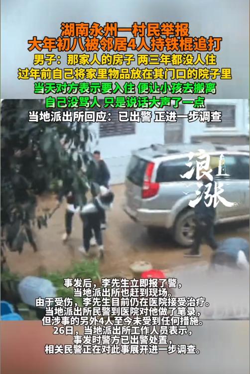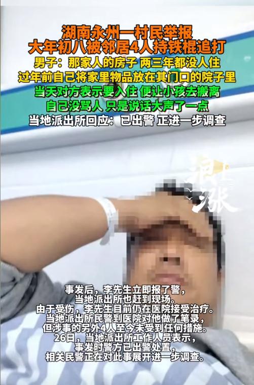 湖南永州,一男子见邻居家多年没人住,于是将自家的杂物堆放在邻居家的院子里,谁知邻居在过年期间竟回来了。男子立即让孩子去把杂物给搬了,但双方还是因此事吵了起来。期间,邻居4人将男子打致住院。男子也报了警,但警方一直未对邻居4人采取措施,这让男子感到十分委屈,称自己已经及时补救了,对方还打人。 永州当地的一个老小区里,被打的男的在这儿住了好些年,跟邻居家就隔了几步路。他邻居家的房子,空了有好几年了,平时大门锁得死死的,从来没人回来过,院子里的草长得比人还高,看着就冷清得很。 男的家里杂物多,自家小院堆得满满当当,实在没地方放,看着邻居家院子空着也是空着,觉得怪可惜的,就想着临时堆在那儿,反正等邻居回来,再搬回去也不迟,应该不会出啥岔子。 就这么着,男的一点点把家里用不上的东西、乱七八糟的杂物,都搬到了邻居家院子的角落里,特意摆得整整齐齐,生怕占太多地方,也没碰邻居家的一草一木。 他一开始还时不时留意着邻居的动静,可一年又一年过去,邻居连个影子都没出现,他也就慢慢放下心来,没再急着把杂物搬回去。 可谁能想到,今年过年的时候,意外就来了。那套常年空着的房子,居然有人回来了,一共4个人,应该是房主一家人,趁着过年放假,回老家住几天、聚聚。 男的刚好在家,一看见邻居回来,心里立马一沉,暗道不好,知道自己堆杂物的事要被发现了。他也没等邻居开口说啥, 赶紧喊来家里的孩子,让孩子麻溜点,把堆在邻居家院子里的杂物全搬回自家,全程都陪着笑脸、放低姿态,就想着赶紧补救,别闹起来。 男的本以为,自己都这么主动补救了,邻居就算有气,也该消得差不多了,可没想到,那4个人看着空荡荡的院子,还是一肚子火,围着他就絮絮叨叨地骂,语气冲得很,全是指责的话。 男的也知道自己理亏,没提前跟人家说就用了院子,所以一直耐着性子听着,一句反驳的话都没说。 可那4个人却得理不饶人,骂人的话越来越难听,越说越激动,到最后,双方就吵了起来。吵着吵着,情绪就失控了,本来就是嘴皮子上的争执,没想到那4个人居然动起手来,围着男的就拳打脚踢。 男的就一个人,面对4个人的围殴,根本没有还手的余地,只能下意识地蜷起身子,用胳膊护住头和胸口这些要害部位。 可那4个人下手一点都不留情,拳头一下下砸在他身上,脚也不停地踹,疼得他直哼哼、直哀嚎。旁边的邻居听见动静,赶紧跑过来拉架,费了九牛二虎之力,才把双方分开。 被拉开的时候,男的已经浑身是伤了,头晕乎乎的,浑身都疼,站都站不稳,身上到处都是青一块紫一块的,嘴角也流了血,看着特别狼狈。 而那4个打人的邻居,被拉开后还是气冲冲的,在一旁骂骂咧咧的,压根没觉得自己打人有啥不对,也没意识到自己闯了祸。 男的又疼又委屈,心里越想越不是滋味——自己明明已经第一时间补救了,赶紧让孩子把杂物搬回去了,一点都没推诿,可对方不仅不领情,还动手把自己打得这么惨,还是4个人一起打他一个。 他强忍着身上的疼,掏出手机报了警,把事情的来龙去脉跟警察说了一遍,就盼着警察能公平处理,让那几个打人的邻居付出代价。 警察接到电话后,没多久就赶到了现场,简单问了问事情的情况,也给男的做了笔录,还安慰了他几句。 之后,男的被家里人送到了医院,检查完才知道,身上多处软组织被打坏了,还有轻微的脑震荡,得住院观察几天,好好养着才能好。 可让男的万万没想到的是,报警之后过了好几天,警察那边一直没对那4个打人的邻居做任何处理,他们该干啥干啥,跟没事人一样,这让男的心里更委屈、更生气了。 对此,你们有什么看法,欢迎评论留言~