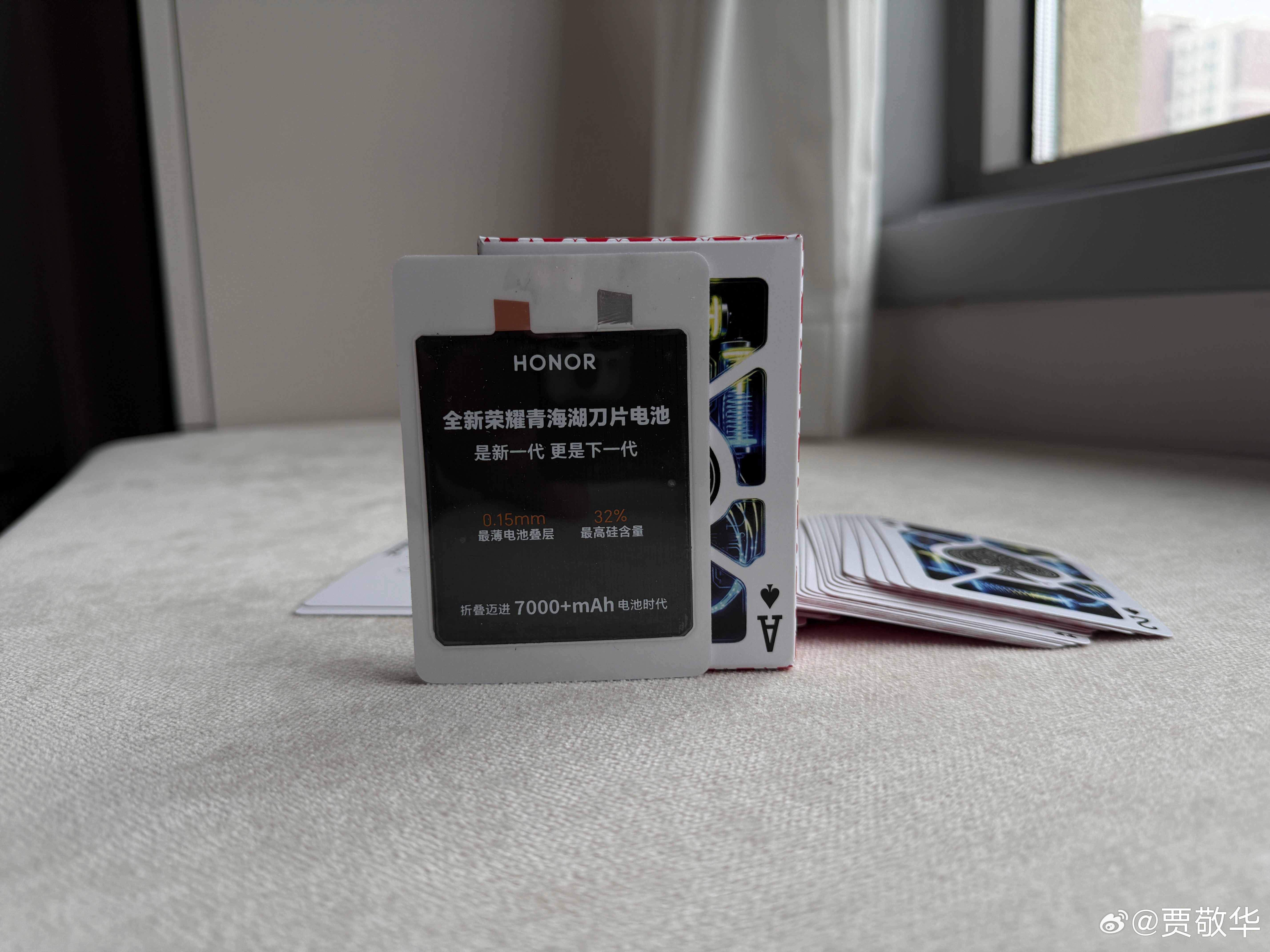 简单的来说,折叠屏手机要想更薄,除了各种配件要足够薄之外,电池能量密度也要更高。刚收到一幅非常有意思的扑克,黑桃A背面是荣耀电池的单层结构,真的太薄了。