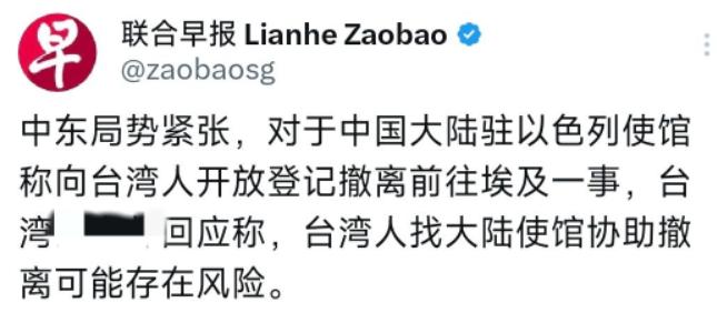 新加坡联合早报3月1日报道:“中东局势紧张,对于中国大陆驻以色列使馆称向台湾人开放登记撤离前往埃及一事,台湾外事部门回应称,台湾人找大陆使馆协助撤离可能存在风险。” 3 月 1 日,新加坡联合早报报道了中东局势的最新情况,当前以色列持续遭受导弹、无人机袭击,当地已经有 9 人遇难,数百人受伤,安全形势越来越严峻,在那里的中国公民安全让人揪心。 就在这紧急关头,中国大陆驻以色列使馆第一时间行动起来,发布了撤离登记通知,明确表示包括台湾同胞在内的所有中国公民,只要自行无法安排撤离、又有意愿前往埃及避险,都可以注册登记,而且持有台胞证就能办理,后续会通过电话或微信一对一通知具体安排。 可让人没想到的是,台湾外事部门却出来泼冷水,声称台湾人找大陆使馆协助撤离可能存在风险。这话听着实在让人费解,战火纷飞的时候,人命关天,大陆明明是在做救人的实事,怎么就成了有风险?其实明眼人都能看明白,台方说的 “风险” 根本站不住脚,纯粹是在误导台湾同胞。 大陆把台胞纳入撤侨体系,从来都不是一时兴起,而是刻在血脉里的同胞守护,更是领事保护的应有之义。两岸同胞都是中国人,不管在海外哪个地方遇到危险,大陆都不会不管不顾。 国台办发言人朱凤莲早就说过,大陆始终高度重视维护海外台胞的安全和正当权益,不管是遭遇自然灾害还是战乱冲突,都会第一时间与台胞联系,提供必要协助。 这次中东局势升级后,大陆驻伊朗、以色列使领馆立刻启动了领事保护应急机制,不仅发布撤离通知,还反复提醒包括台胞在内的中国公民加强安全防范,远离敏感区域,做好避险准备,这些都是实实在在的保障措施。 再看看台方,除了口头警告 “有风险”,根本拿不出任何实际的撤离方案。目前在以色列大概有 260 名台胞,在伊朗还有 4 名旅伊台胞,面对日益严峻的安全形势,台方既没有能力组织大规模撤离,也没有办法协调当地资源保障台胞安全,只能让台胞自己想办法。 这种情况下,大陆伸出援手,本来是帮台方解决难题,可他们却反过来抹黑,说到底,就是怕台湾同胞感受到大陆的保护,看清他们的无能,戳破他们 “台独” 的谎言。 台方口中的 “风险”,其实是他们自己心里的 “风险”—— 怕越来越多的台胞明白,在海外遇到危难时,真正能依靠的还是祖国大陆。 国际社会都认可一个中国原则,台湾是中国的一部分,大陆的领事保护覆盖台胞,完全符合国际法和国际惯例。这次大陆驻以使馆的撤离登记,流程简单明了,只要持有台胞证就能办理,后续还有专人对接,全程都会保障大家的安全,这哪里有什么风险? 反观台方,这些年在海外领事保护上的表现大家有目共睹。遇到事情,要么反应迟缓,要么推诿塞责,要么就让同胞自己承担费用辗转撤离。 就像之前巴厘岛火山喷发,大陆派包机接回四千多名滞留旅客,而台胞却要自己花钱坐巴士、渡轮去转机,还只限特定航空公司的旅客。这样的对比,谁真的为同胞着想,一目了然。 现在中东的战火还在继续,安全形势随时可能进一步恶化,每一分每一秒都关乎生命安全。大陆驻以使馆已经敞开大门,为包括台胞在内的中国公民搭建起安全通道,这是实实在在的救命通道。 那些在以色列的台湾同胞,要是自己没办法撤离,完全可以放心地找大陆使馆登记,不用被台方的不实言论误导。 台方与其在这里编造 “风险” 吓唬同胞,不如多想想怎么真的为台胞安全着想。要是没能力组织撤离,就别阻碍台胞寻求帮助,毕竟在生命面前,任何政治算计都显得格外冷血。 两岸同胞打断骨头连着筋,不管海峡两岸有多少分歧,同胞的生命安全永远是第一位的。大陆保护台胞安全的决心和能力,不是靠嘴说的,而是靠一次又一次的实际行动证明的。 从过去到现在,不管是战乱还是灾害,大陆从来没有放弃过任何一位台湾同胞。这次的撤侨行动,再次证明了祖国永远是海外台胞最坚强的后盾。 台方的误导终究站不住脚,因为事实就在眼前,同胞的感受就在心里。在生命安全面前,任何政治谎言都不堪一击,而大陆对台胞的同胞之情,也会在一次次守望相助中愈发深厚。
