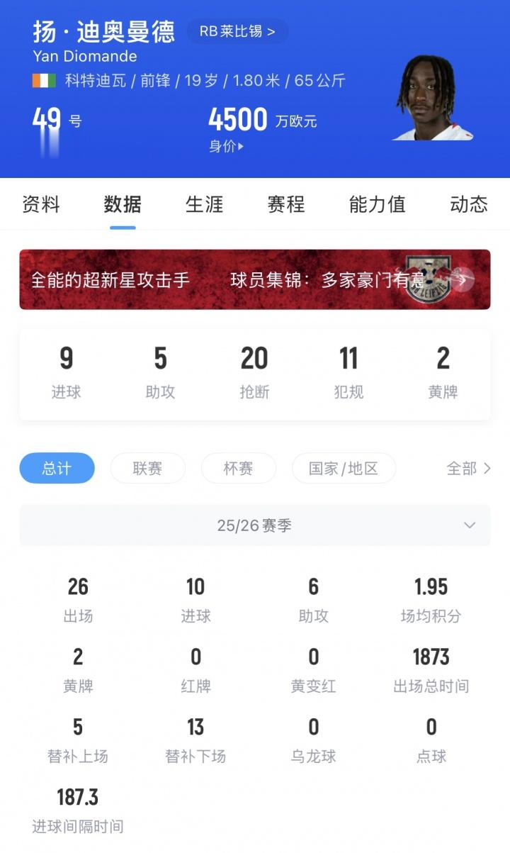 迪奥曼德现年19岁,去年夏天2000万欧加盟莱比锡,他本赛季出场26次,贡献10球6助,现身价4500万欧,他与莱比锡的合同到2030年。