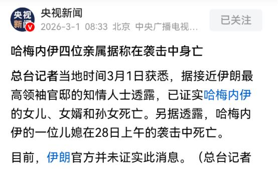 情况不对!央视发文:哈梅内伊四位亲属遇害! 3月1号早上我国央视新闻对外发布消息,声称总台记者获悉伊朗最高领袖官邸的知情人士已经证实,哈梅内伊的女儿、女婿和孙女以及一位儿媳在28号上午的袭击中死亡。不过该消息目前并没有得到伊朗官方的证实。 其中,最让人唏嘘的是这里面还有哈梅内伊17岁的孙女,还是个在上中学的孩子,就因为身份特殊,跟着家人一起遭遇了这场劫难,想想就让人心里不是滋味。 而且这四位亲属里,除了哈梅内伊的女儿可能偶尔出现在公众视野,女婿、儿媳和孙女基本都是普通人,没参与过什么政治事务,却成了袭击的受害者,这种连无辜家属都不放过的做法,实在是没底线。 现在最有意思的就是各方的表态,简直是各唱各的调。央视这边已经把知情人士证实的消息播出去了,可伊朗官方那边却一直没松口,既不承认四位亲属遇害,也不否认,就这么拖着。 其实也能理解,哈梅内伊作为伊朗的最高领袖,他的亲属遭遇不测,要是官方直接证实,很可能会引发国内民众的恐慌和愤怒,甚至影响局势稳定,所以暂时不表态,也是一种稳妥的做法。 不过伊朗民间已经炸了锅,有网友在社交平台上晒出哈梅内伊以前抱着小孙女的老照片,照片里爷孙俩笑得很亲切,和现在这场突如其来的袭击形成了鲜明的对比,看得不少人都唏嘘不已。 还有德黑兰的一些民众,自发聚集起来,举着哈梅内伊亲属的照片,发泄内心的愤怒,毕竟这种伤及无辜家属的袭击,换谁都不能接受。 这场袭击本身,能精准找到哈梅内伊亲属的位置,还能在2月28号上午精准发动袭击,绝对不是偶然。知情人士没说袭击者是谁,但稍微有点常识的人都能猜到,大概率和美国、以色列脱不了干系,毕竟这两个国家一直和伊朗不对付,之前就多次针对伊朗高层采取过行动。 而且根据央视援引的消息,袭击发生的时候,哈梅内伊本人并不在亲属身边,侥幸躲过了一劫,这也让人怀疑,袭击者的目标到底是哈梅内伊本人,还是故意针对他的亲属,想用这种方式打击他的心理,削弱他的影响力。不管是哪种目的,连无辜家属都不放过,这种做法都让人不齿。 现在大家最关心的,就是伊朗官方什么时候会给出明确表态,四位亲属遇害的消息到底是不是真的。毕竟央视都播了,要是伊朗官方一直不回应,难免会引发更多猜测,甚至可能影响伊朗国内的稳定。 不过按照伊朗的行事风格,大概率会在局势稍微平稳之后,再对外公布具体情况,不会贸然发声。 其实不管消息最终是否得到证实,央视能发文报道这件事,就说明事情的严重性。哈梅内伊作为伊朗的最高领袖,他的亲属遭遇袭击,本身就牵动着整个中东地区的局势,而央视的报道,也让我们能及时了解到这件事的进展,不至于被各种小道消息误导。 说到底,这场袭击最无辜的就是哈梅内伊的四位亲属,他们没有参与任何政治纷争,却成了权力斗争的牺牲品。希望伊朗官方能尽快核实消息,给公众一个交代,也希望这种伤及无辜的事情不要再发生。 至于后续事情会如何发展,我们也只能继续关注央视的报道,等待进一步的消息。毕竟在这种敏感时刻,任何风吹草动,都可能引发更大的波澜,谨慎对待才是最稳妥的。