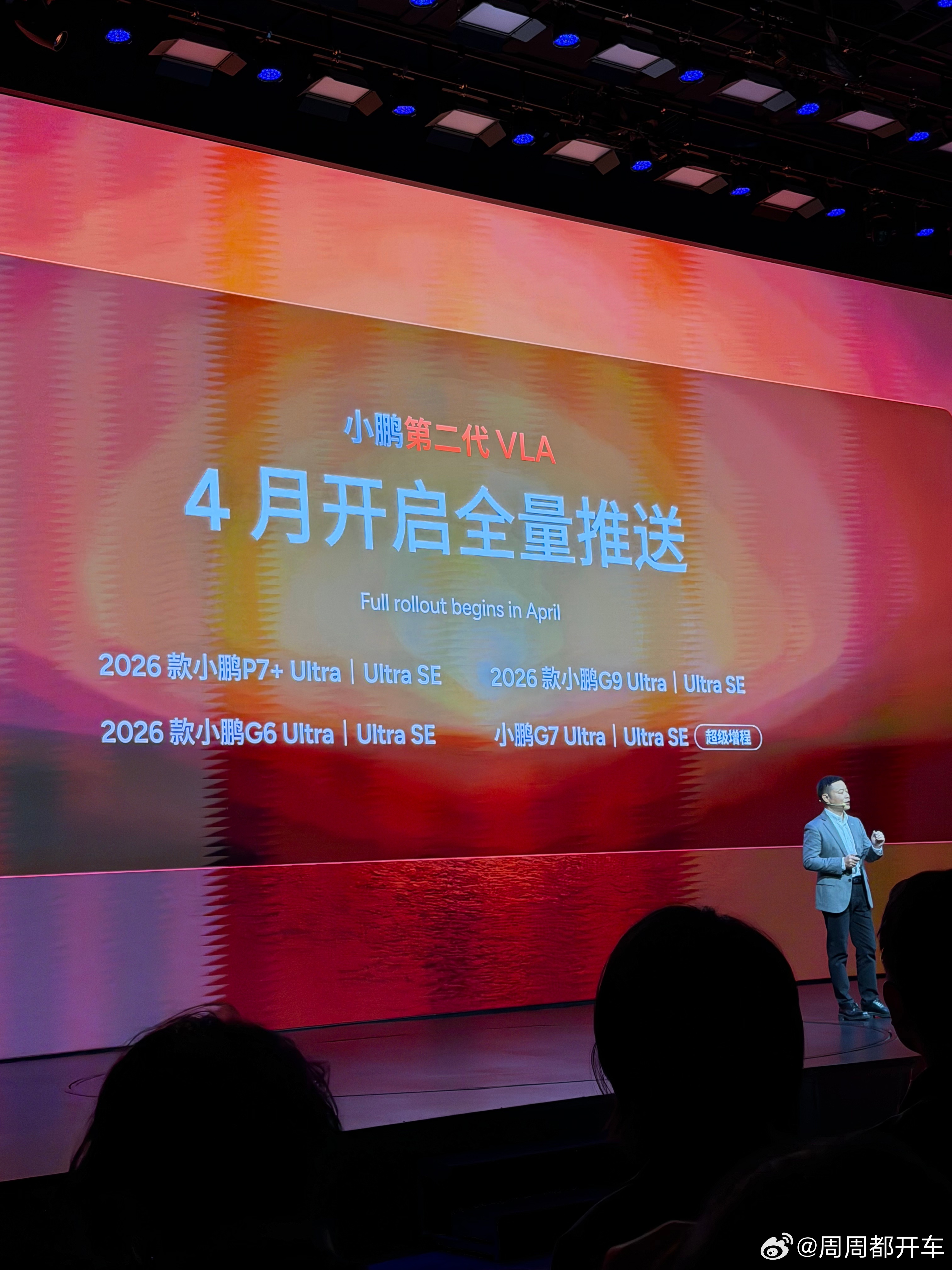 小鹏第二代VLA智驾的推送时间大概分为三批个时间:第一批是3月下旬,包含26款全新的P7、G7纯电、X9。第二批是4月下旬,包含26款全新的P7、G6、G9、G7增程。第三批是老车主Max车型,时间待定,将会更新蒸馏版本的第二代VLA。这里大部分老车主最关心的Max车型能用的蒸馏版本的第二代VLA到底使用体验到底如何?应该体验差距不会太大,因为说白了现在的新车Ultra版本的智驾,你把它理解为是建立在车上的智驾方案。而max的蒸馏版更像云上的智驾方案。更通俗的讲Ultra版本的第二代VLA就是一个在没网的地方也能开,是真正的全球都能开,根本不挑地方。max蒸馏版更依赖联网后才能发挥出全部实力的智驾。小鹏第二代VLA发布小鹏智驾负责人称拉开差距的时刻到了