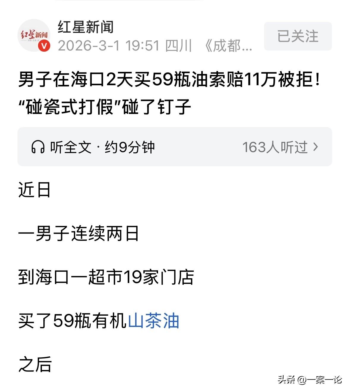海南海口,男子2天时间跑了某超市19家门店,花11730元买了59瓶有机山茶油,买完就找超市索赔11万,理由是瓶身上的“有机认证标志”过期了。超市知道这是遇上“碰瓷式打假”了,一口回绝。男子也不吵,转头就发三篇小作文举报该超市,这下供应商坐不住了,赔了5000块息事宁人。 李某某手里攥着那一叠厚厚的购物小票,嘴角忍不住往上翘。 这一趟海口之行,算是来对了。 2月8号、9号这两天,这位辽宁来的爷们儿啥景点也没逛,专门盯着海口一家超市旗下的19家门店跑。 他一家接一家,像搞批发一样,连买带扫,硬是囤了59瓶“有机山茶油”,算下来总共花了11730块钱。 不过,他买这油可不是为了吃,而是盯上了瓶身上的那个“有机认证标志”。他是有目的的。 买完没几天,李某某就找上超市了。 他指着瓶身贴的溯源码,说这标志的有效期到2024年10月16日就过期了,现在卖这就是卖假货,按规矩得赔!张口就要11万的赔偿金。 超市负责人听后一脸震惊,当时就反应过来,他们这是碰上职业打假的了。 但李某某不跟你吵,转头就去平台上发帖子曝光,三篇小作文一发,直接给超市扣上“销售涉假有机油”的大帽子。 这一招确实狠。现在的舆论环境,一点火星就能燎原。超市虽然坚称自己进货流程没问题,但也怕影响生意,只能先把涉事的油下架再说。 供应商苗先生这时候坐不住了他心里非常憋屈。 这批货质量是实打实的,新的有机认证证书10月17日就续上了,纯粹是厂里工人手滑,用了点旧的溯源码,贴错了。 这就是个标签瑕疵,哪至于赔11万?苗先生一开始也硬气。可李某某的帖子越炒越热,甚至还扬言要找市场监管部门。 苗先生算了笔账,要是真把事情闹大,不仅要应付检查,品牌声誉受损更是无底洞。 就当破财免灾吧!苗先生叹了口气,最终选择了妥协。 2月27号,苗先生跟李某某坐下来和谈。 经过一番交流,李某某把赔偿金降到5000块,说给钱这事就翻篇。 苗先生也麻溜转了账。 钱一到账,李某某之前的剑拔弩张全没了,他乖乖删了网上的三篇举报帖,还写了份撤诉申请书给市场监管部门。 理由就是:合法权益已保障,无法进一步举证。 这一波操作,看得人目瞪口呆。超市方面虽然没直接赔钱,但看着供应商为了平息事态掏了5000块,心里也不是滋味。 负责人无奈地说:这哪是打假,这就是精准的‘碰瓷’! 好在市场监管部门眼睛雪亮。经调查,这批山茶油本身质量没问题,符合标准。 但标签贴错毕竟是事实,监管部门直接下令:必须整改! 李某某拿着5000块钱,大概率已经在回辽宁的路上偷着乐了。 但这事儿留给商家的教训却够喝一壶的。现在的“职业打假人”早就不是当年的“王海”了,人家玩的是流程、是舆论、是心理战。 哪怕你只是贴错一个码,只要被盯上,就得做好被扒层皮的准备。 不过,随着新规实施,这种靠找茬勒索的日子,恐怕也没那么好过了。 根据新修订的《市场监督管理投诉举报处理办法》第15条第3项规定:投诉不是为生活消费需要购买、使用商品或者接受服务的,市场监督管理部门不予受理。 这条新规简单说就是:“职业打假人”想靠恶意投诉勒索商家,以后这条路走不通了。 以前像李某某这种,一次性买59瓶油,明显超过普通人家里吃的量,不是为了吃,纯粹是为了找茬索赔赚钱的“碰瓷式打假”,只要他去投诉,市场监管部门就得被迫启动调查程序,商家就得陪着耗精力。 但新规下,监管部门一看这购买量和频率,就能直接认定“这人不是真消费者”,直接拒绝受理他的投诉。 这对商家是个护身符,不用再被迫花钱私了来息事宁人。 不过,这不代表商家就能乱来。就像案例里供应商虽然没被李某某讹诈成功,但因为标签确实贴错了,依然被监管部门责令整改。 新规打击的是“借打假之名行敲诈之实”的人,但对于真实的商品质量和标签瑕疵,监管的板子依然会打在商家身上。 这算是给真正的经营者减负,同时也倒逼商家自己把品控做得更严。 对于这件事,你怎么看? 欢迎关注@一案一论