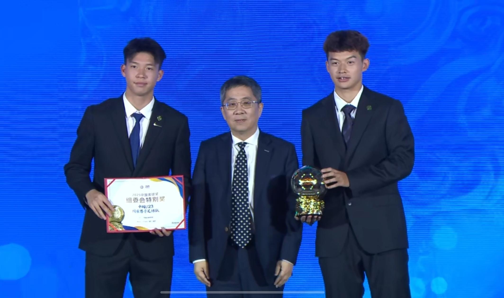 王钰栋和刘浩帆作为代表领奖,中国足协副主席许基仁为他们颁奖。