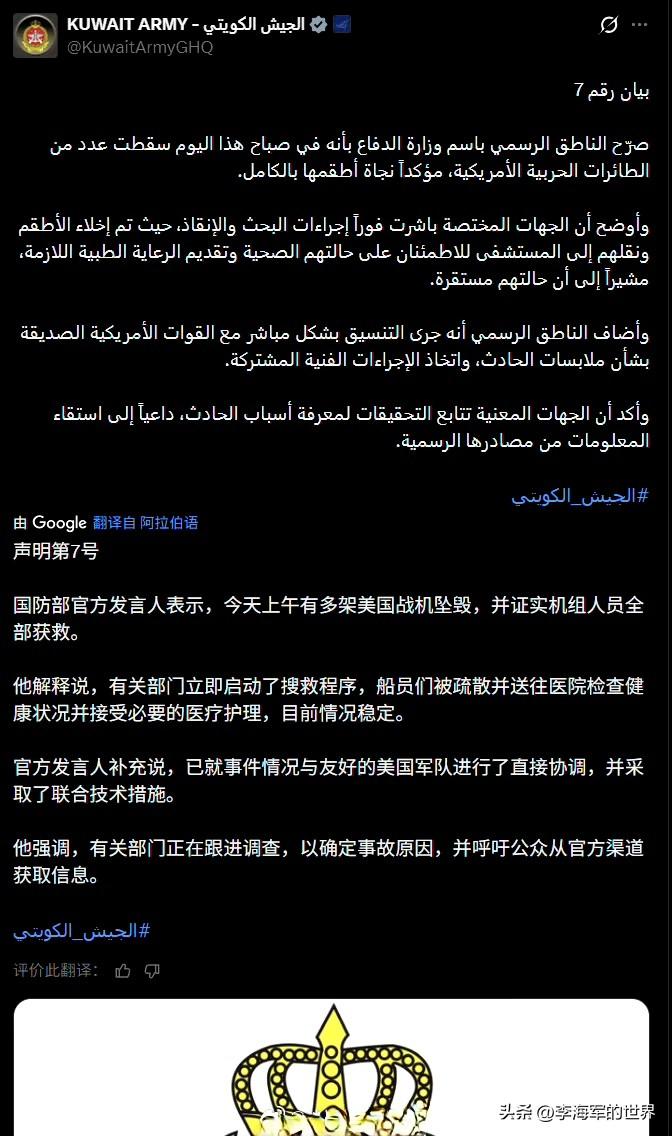 科威特国防部称:“几架”美国战机坠毁,不过所有机组人员均幸免于难。 胆子可真不小,竟敢揭露美国的丑事。 国防部官方发言人透露,今日上午有多架美国战机坠毁,并确认机组人员全部获救。 这下总没法说是友军误击了吧? “多架”的说法,值得探讨。两架、三架不能算多架,起码得五六架才行。 从视频中能看到有三名飞行员,其中一名是女性,这至少说明有两架战机。 至于坠毁的是否都是F - 15,就不好说了,毕竟参与打击伊朗的飞机型号众多,有F15、F16、F35、F22、F18。要是有隐形飞机坠毁,那可就有好戏看了。 美国方面宣称是友军误击。 这种可能性确实存在。 至于友军是有意还是无意击中美军飞机,就难以判断了。 众所周知,伊朗存在内鬼。 但你不能排除其他国家就没有内鬼。 其实不管是飞机被误击,还是被伊朗击落,总之它坠毁是事实,谁击落的并不重要,关键是它真的坠毁了。