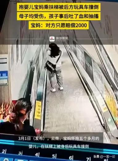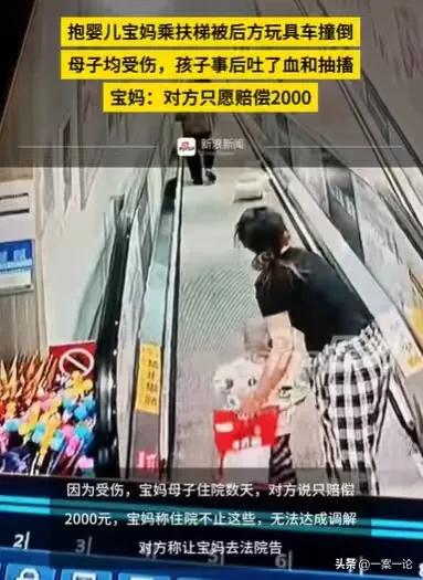 云南,一女子带着孩子和玩具车要下扶梯,她先是把玩具车放入扶梯,转头抱孩子,可就在她放孩子在扶梯上时,玩具车已经快速滑了下去,她眼睁睁地看着玩具车滑下去,下面也有人,她也不喊一声,结果一个宝妈被玩具车绊倒,怀中5个月大的孩子,摔了出去,事后,母子俩都受伤了,孩子两次吐血,还抽搐,女子只愿意赔偿2000元,宝妈报了警,女子还找了八九个人围着她,并喊道,让宝妈去起诉她。 事情发生在去年的9月29日,当时这个宝妈带着5个月大的孩子逛商场,下扶梯的时候,她特别的小心,因为怀里抱着孩子,她做什么都是小心翼翼的。 可她完全没有注意到,在她上方,一个女子带着一个年幼的孩子,还有一个扭扭车,他们也准备下扶梯。 因为女子的孩子也还小,她不方便一边抱着孩子,一边拎着扭扭车。 她就先是把扭扭车放到扶梯上,然后转过身来抱起孩子放到扶梯上。 就在这一刻,意外发生了,她看着扭扭车,居然快速地滑了下去,前面除了宝妈抱着孩子,还有一位阿姨。 可她眼睁睁看着扭扭车就要撞到宝妈了,她却没有喊一声。 意外就这样发生了,扭扭车撞到了宝妈,宝妈站不稳直接摔倒,怀里的5个月的孩子也摔了出去。 孩子瞬间摔得哇哇大哭,此时扶梯也马上到了终点,如果孩子没有被及时抱起,有可能会受到第2次伤害。 就在这千钧一发的时刻,后方的阿姨,赶紧蹲下去把孩子抱了起来,孩子这才没有受到第2次伤害。 即使如此,宝妈和孩子都受伤了,宝妈不敢掉以轻心,就赶紧带着孩子一起去医院检查。 此时让她更难以接受的事情发生了,她和孩子去到医院,那名女子居然打电话叫了八九个人过来,团团围着她。 那时的宝妈真的好烦,孩子疼得哇哇在哭,自己也不舒服,腰也受伤了,看着这几个人,宝妈不知道他们想干啥,只好打电话给丈夫,丈夫告诉她,赶紧报警,宝妈这才报了警。 可这些人居然问她,报警的目的到底是什么,宝妈从来没有遇到过这种情况,民警过来之后,她只能实话实说,她和孩子这才得以检查。 她受伤了,她倒不是特别在意自己的伤,她担心的是孩子,她害怕孩子哪里出血,就给孩子做了检查,检查一遍,她还不放心,又到别的医院做了一次检查,孩子也没有什么问题,宝妈这才松了一口气。 女子一看,孩子没什么问题,他们也不再管这件事了。 可是这件事过去了10多天,10月10号那天,她的孩子突然吐了两次血,她吓得半死,而且孩子还会抽搐,她更加担心了,这肯定和那一次摔倒有关。 宝妈只好带着孩子去治疗,住院住了十几天,可是女子这边却说,孩子住院和她没有关系,宝妈给她发信息不回,打电话不接,女子只好又寻找民警帮忙。 女子这才表示愿意给2000元赔偿,2000元,这点钱都不够他们住院的费用,宝妈当然不愿意,但女子表示,多一分钱也不会给,想多要赔偿,那就起诉她。 看着女子态度这么嚣张,宝妈很无奈。 自从孩子出了事,她的丈夫也不怎么管孩子,现在这个女子,又不愿意对这件事负责,她感受到很大的压力。 她最害怕的就是,如果孩子因为这件事,身体上出了毛病,她真不知道如何是好。 发生这样的事情,她当然要追究女子的责任。 在这件事情当中,那个女子肯定是有过错的,是要承担过错责任的。 《民法典》第1165条规定:行为人因过错侵害他人民事权益造成损害的,应当承担侵权责任。 在当时的情况下,如果她喊一声,意外可能就不会发生。 在由于她的过错导致意外的发生,那么她就应当承担责任,进行赔偿。 《民法典》第1179条规定:侵害他人造成人身损害 的,应当赔偿医疗费,护理费,交通费,营养费,住院伙食补助费等为治疗和康复支出的合理费用,以及因误工减少的收入。造成残疾的,还应当赔偿辅助器具费和残疾赔偿金。 至于要赔偿多少,则要根据宝妈和孩子的实际情况进行赔偿。 那么你对这件事有何看法呢?