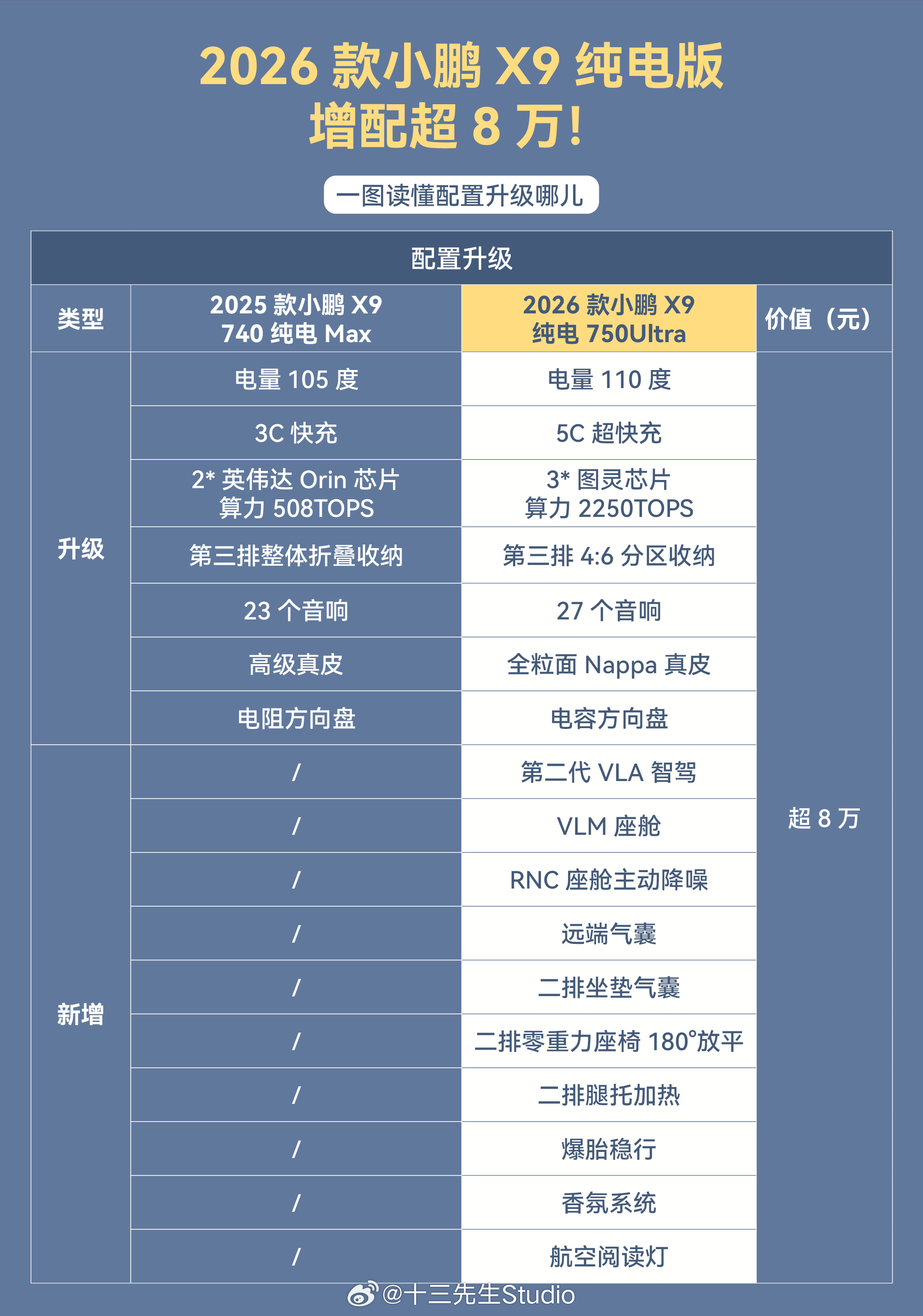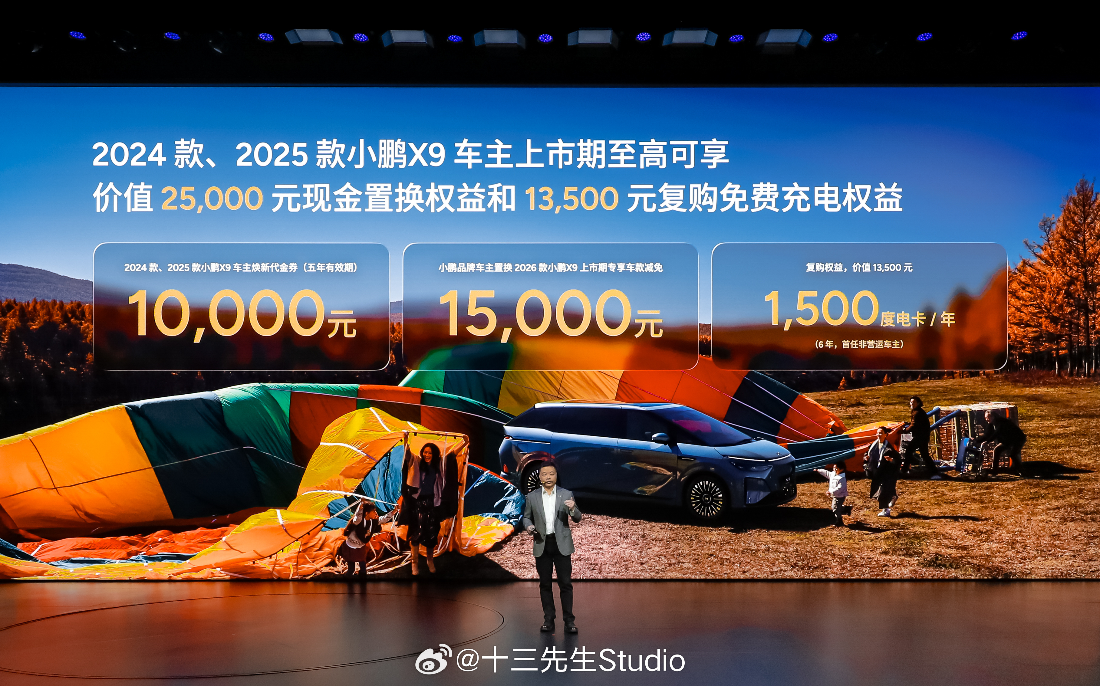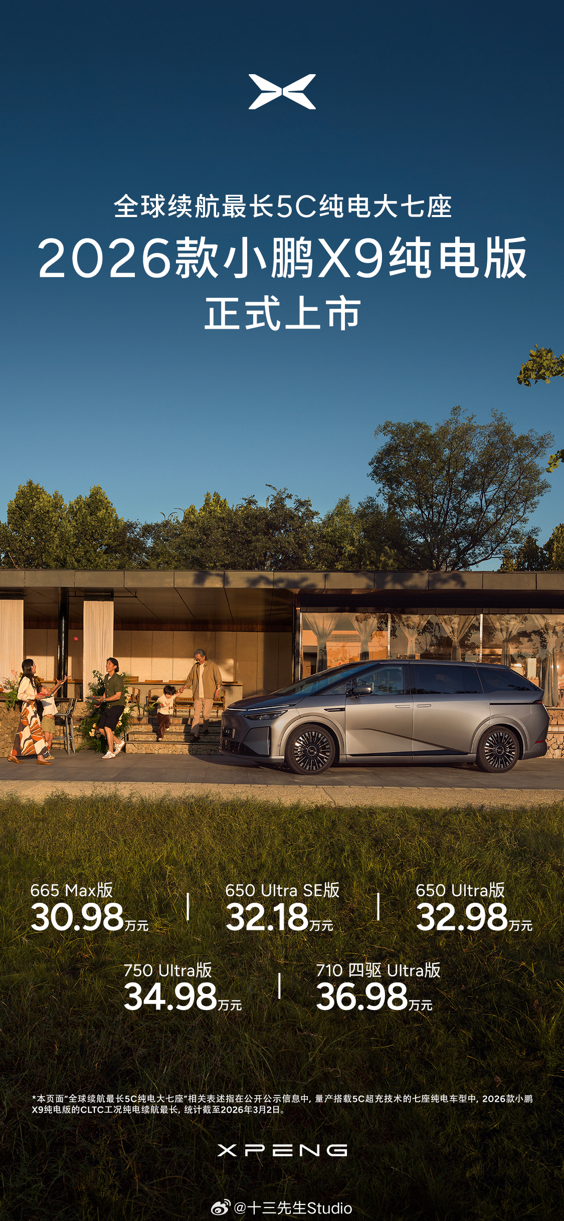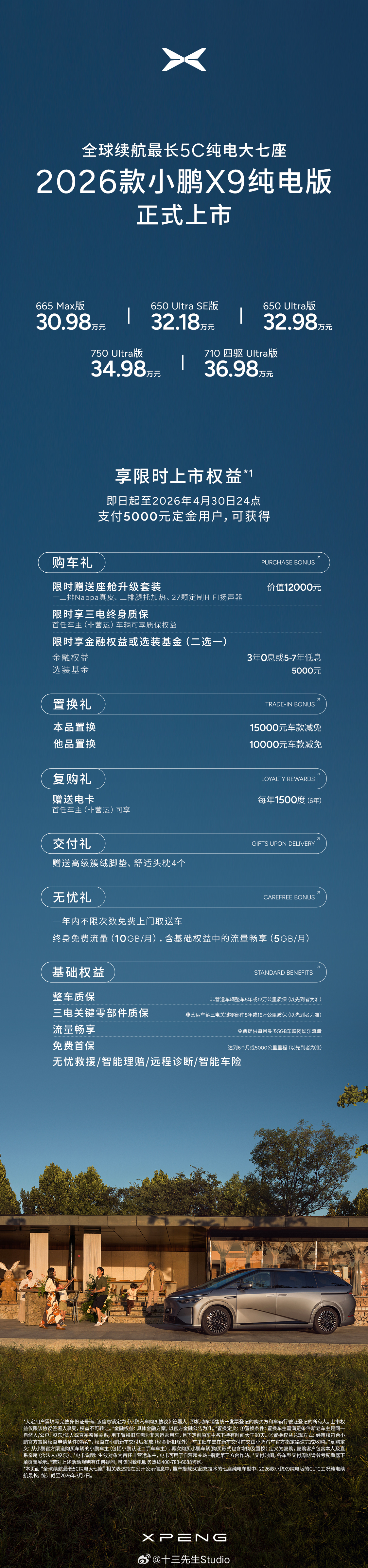 2026款小鹏X9纯电版共推出了5款版型,包括665 Max、650 Ultra SE、650 Ultra、750 Ultra以及710 四驱Ultra,指导价分别为30.98万、32.18万、32.98万、34.98万、36.98万;纯电版的起售价和增程版是相同的,同时2026款小鹏X9超级增程新增了1602 Ultra SE版本,价格为32.18万。权益方面,4月30日前下定纯电版,权益包括三电终身质保、价值12,000元的座舱升级套装、至高价值30,000元金融/选装基金、至高价值15,000元置换权益以及每年1500度电卡(6年)的复购权益。2026款小鹏X9超级增程的权益相同,但时间为2026年3月31日前下定。对于24和25款的X9老车主置换26款X9,则是可以获得额外1万元的代金券补贴。(2025年11月20日已发放)同时还有早鸟权益,今晚10点前下定全车系,可享受2000元抵7000元购车款权益,相当于优惠5000,这场发布会亮点除了第二代VLA,给出的价格和权益相当可以。