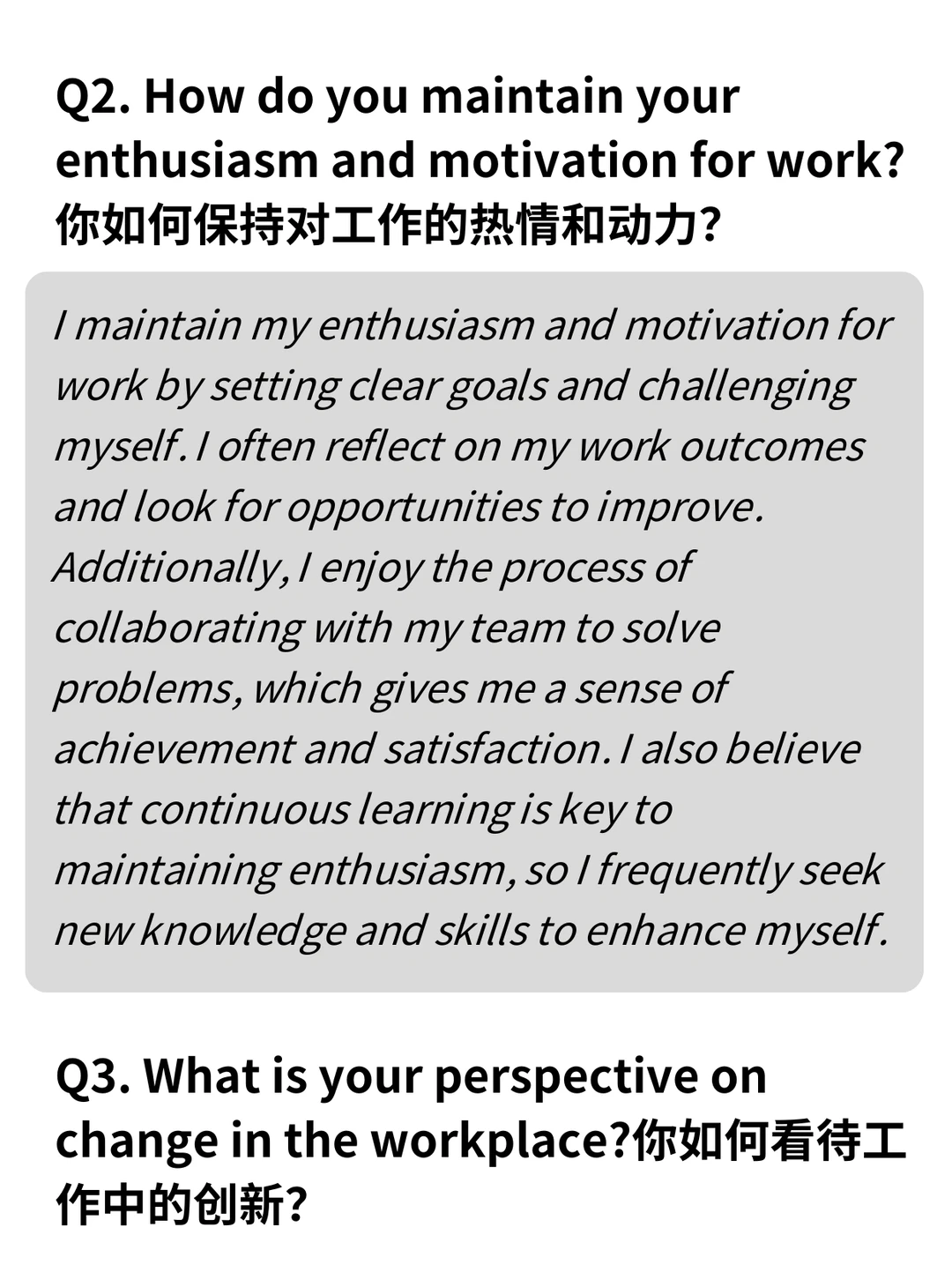 Q2. How do you maintain your enthusiasm and motivation for work?你如何保持对工作的热情和动力?