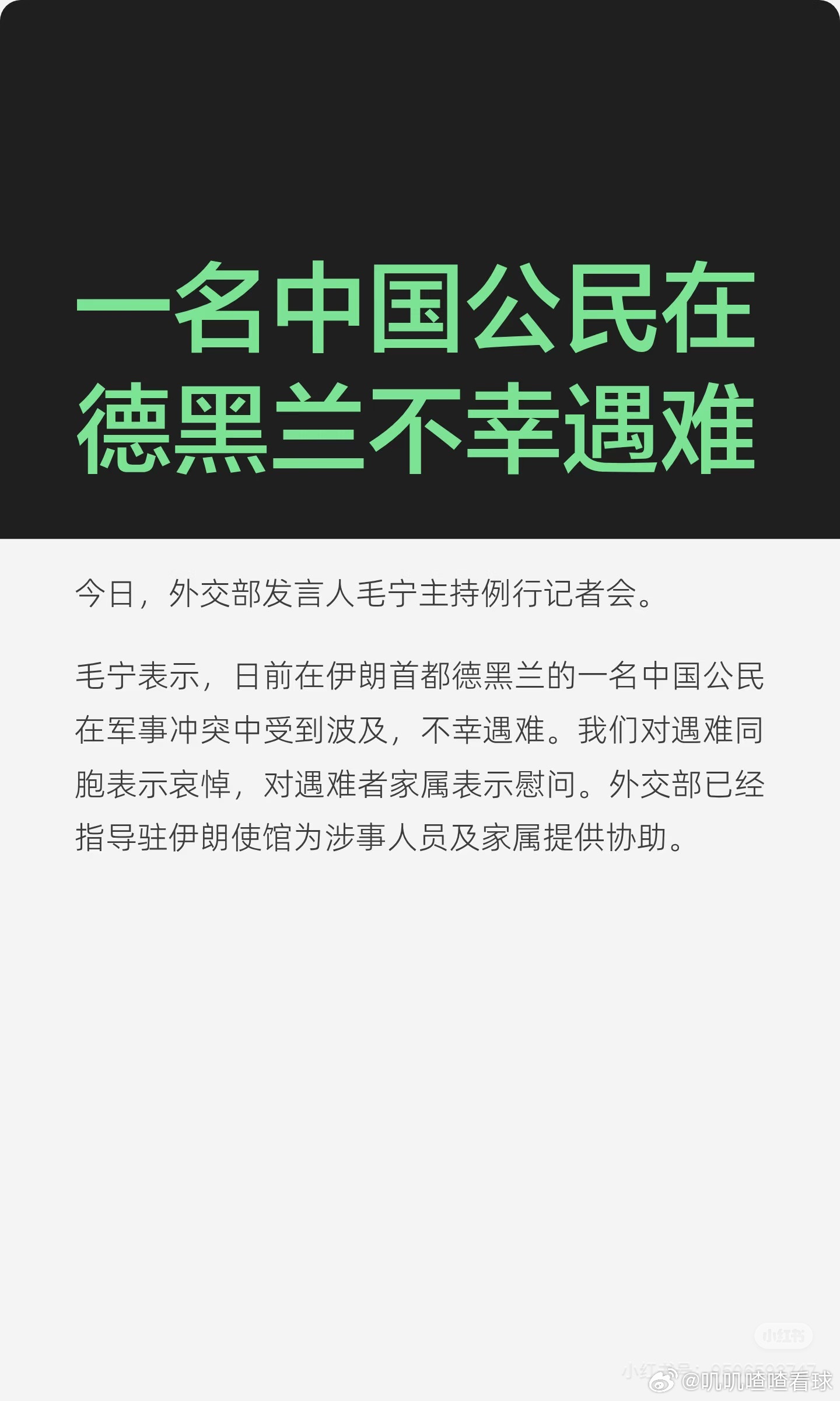 伊朗一名中国公民遇难伊朗一名中国公民遇难,外交部回应今日,外交部发言人毛宁主持例行记者会。毛宁表示,日前在伊朗首都德黑兰的一名中国公民在军事冲突中受到波及,不幸遇难。我们对遇难同胞表示哀悼,对遇难者家属表示慰问。外交部已经指导驻伊朗使馆为涉事人员及家属提供协助。来源:央视新闻