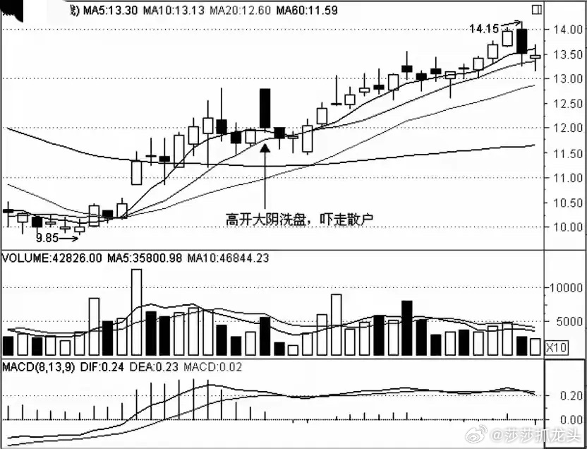 这是最经典的一种洗盘手法。股价本来走得好好的,突然毫无征兆地跌穿短期均线,制造破位恐慌。但仔细看成交量,坑里面是明显缩量的,甚至比之前横盘时的量还小。这就是典型的“黄金坑”,主力自己没跑,只是吓唬人。坑底缩量越明显,后面的拉升往往越猛。