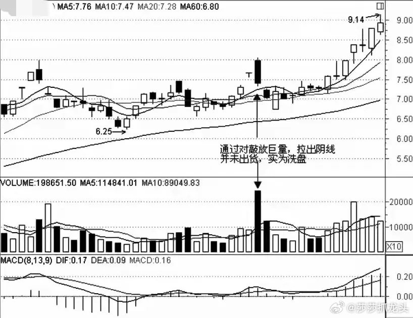 洗盘结束后的健康走势应该是:上涨的时候成交量温和放大,下跌回调的时候成交量快速萎缩。这说明跟风盘和抛压都在主力的掌控之中。如果出现上涨无量、下跌放量,那就是出货而非洗盘,这一点要刻在脑子里。