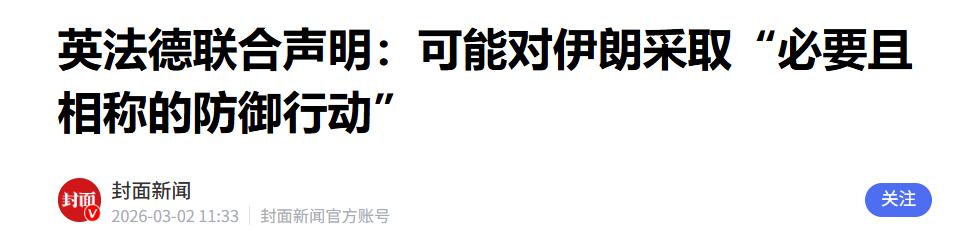 这真是一波未平,一波又起!参考消息,刚刚发布了一条消息,就在美国以色列,不讲国际法理道义,对伊朗狂轰滥炸的时候,没想到英国、德国、法国也跳出来了! 据参考消息,3月2日,援引英国媒体每日邮电报报道,英法德联合声明:可能对伊朗采取“必要的防御行动”。 这句话听起来好像挺“中立”,说的是“防御”,但明眼人都能看出来,这就是在帮着美国和以色列打压伊朗,就是在拉偏架,根本没有一点公平可言。 美以这次打击的规模特别大,美国总统特朗普还公开说,要把伊朗的导弹工业“夷为平地”,还要消灭伊朗海军,确保伊朗不能获得核武器。 这次空袭还造成了无辜平民伤亡,伊朗南部一所女子学校就有51人死亡、60人受伤,都是手无寸铁的老百姓,实在是太可怜了。 面对美以的狂轰滥炸,伊朗肯定不能坐以待毙,随后就展开了报复性反击,用导弹和无人机打击了美国在中东多个国家的军事基地,还有以色列的军事和安全中心。 伊朗方面也明确说了,他们无意攻击海湾地区的邻国政府,只是打击那些被美国用来对付自己的军事基地,毕竟那些基地虽然在别的国家境内,但实际上就是美国的领土,是美国用来威胁伊朗的工具。 本来这件事,明眼人都能看出来,是美国和以色列先挑起来的,是他们先违反国际法,主动发动袭击,伊朗的反击只是正当防卫,合情合理。 可就在这个时候,英法德三国跳了出来,发表了那份所谓的“防御行动”声明,明着暗着帮美以说话,还谴责伊朗的反击是“鲁莽的袭击”。 可能有人会问,英法德以前不是有时候会批评美国的中东政策吗?英国还总说要“战略自主”,怎么这次这么快就站到美国那边了?其实根本不是他们被动卷入,而是早就有准备,主动选择站队美国。 最直接的导火索,就是3月1号凌晨,英国在塞浦路斯的阿克罗蒂里空军基地发生了爆炸,英国没经过任何核实,就认定是伊朗干的,立马就允许美军使用这个基地打击伊朗目标,当天还出动台风战机,在卡塔尔上空击落了一架伊朗无人机。 不光是英国,法国也行动起来了,把“戴高乐号”核动力航母紧急调往东地中海,随时准备配合美军行动;德国虽然没直接派兵,但在政治上完全和英法保持一致,明确表态支持所谓的“防御行动”。这三国嘴上说着“没有参与美以对伊朗的打击”,但做的每一件事,都是在帮美以撑腰、递刀。 他们之所以这么做,根本不是什么“为了地区稳定”,而是有自己的私心,说白了就是利益捆绑。美国在中东的军事存在,对欧洲来说,相当于一个“保险”,关系到欧洲的能源通道和地缘稳定。 大家都知道,霍尔木兹海峡是世界上最重要的石油通道之一,如果伊朗因为被持续打击而关闭这个海峡,油价就会飙升,欧洲的经济就会首当其冲受到影响,到时候他们的日子也不好过。 另外,英法德都是北约成员国,虽然有时候会和美国闹点小矛盾,但在安全问题上,他们根本离不开美国。 这次美国在中东压力很大,兵力分散,急需要欧洲国家出来站台,英法德正好借机表态,巩固和美国的同盟关系,同时也能趁机争夺中东的话语权,毕竟这场冲突,本质上也是在争夺未来十年中东的秩序归属。 大家可别以为英法德的声明只是空喊口号,他们已经开始采取实际行动了,而且分工明确,配合得十分默契。英国负责空中拦截和基地支援,除了出动战机,还开放了多个军事基地给美军使用;法国出动航母,提供远程打击能力,还能构建立体防御体系;德国则在后勤、情报和防空系统维护上提供支持,帮美军补充弹药、燃料,还共享伊朗的军事情报,让美军的打击更精准。 更让人不齿的是,英法德作为有影响力的国家,还在国际上为美以的行为辩护,把美以的“侵略”包装成“自卫”,把伊朗的“正当防卫”说成“挑衅”,这就是典型的双重标准。他们还试图施压其他国家,孤立伊朗,营造一种“全球围堵伊朗”的舆论氛围,说白了就是一群强国抱团,欺负一个主权国家。 现在中东的局势已经够紧张了,美以的狂轰滥炸已经让很多无辜百姓流离失所,而英法德的加入,无疑是火上浇油,让局势变得更加危险,随时都有可能升级成更大规模的地区冲突。到时候,受苦的还是那些普通老百姓,他们会失去家园,失去亲人,陷入无尽的苦难之中。