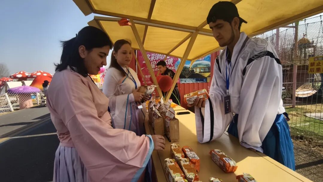 土库曼斯坦留学生莉娜(中)正在景区内跟同学们一起推介俄罗斯特色产品
