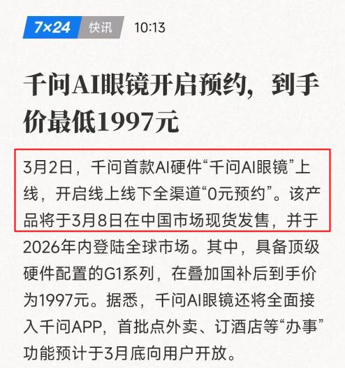 西方国家猛然发现,形式已经大变,中国AI的进攻已经开始了! 刚刚看到消息,千问最新上线的首款硬件产品“千问AI眼镜”在MWC世界移动通信大会上开启了首秀。 同时千问还官宣,这一次上线的千问AI眼镜已经开启0元预约,3月8日将在中国现货开售,2026年内将登陆全球市场。 更为直接的是,在MWC上,千问的展位居然位于Meta正对面。 从种种迹象不难看出,千问已经率先发起攻势,开始在正面参与全球AI竞争,开始和Meta、谷歌、苹果等国外巨头企业掰一掰手腕了。 其实咱们仔细了解就会明白,千问AI眼镜确实有对标海外巨头的实力。 在技术支持上,千问AI眼镜搭载的是最新一代的千问大模型,而作为世界第一大开源模型,千问大模型多次拿下全球开源冠军,有着足够的实力去支撑千问AI眼镜参与竞争。 在硬件配置上,千问AI眼镜也是最顶级的,其主打性价比的G1系列就配备了双旗舰芯片双系统、五个麦克风阵列加骨传导、大振膜高性能喇叭声学硬件,拥有超高的音频体验。 在摄像方面,G1也具备手机级摄像技术,能够实现0.6秒极速抓拍,并且支持3K视频录制,表现同样亮眼。 业内首发“超级夜景+热插拔换电+64G大存储”三重越级配置。 而且更重要的是,千问AI眼镜具备其他AI眼镜所没有的独特“办事”能力。千问AI眼镜全面接入了千问APP,能够一句话就实现点外卖、订酒店、打车等操作,真正做到说完就做完、AI帮我们做事的极致体验。 不得不说,千问再一次让全世界明白了一个道理,中国AI已经彻底崛起了,东西方AI形势已经发生天翻地覆的变化了。