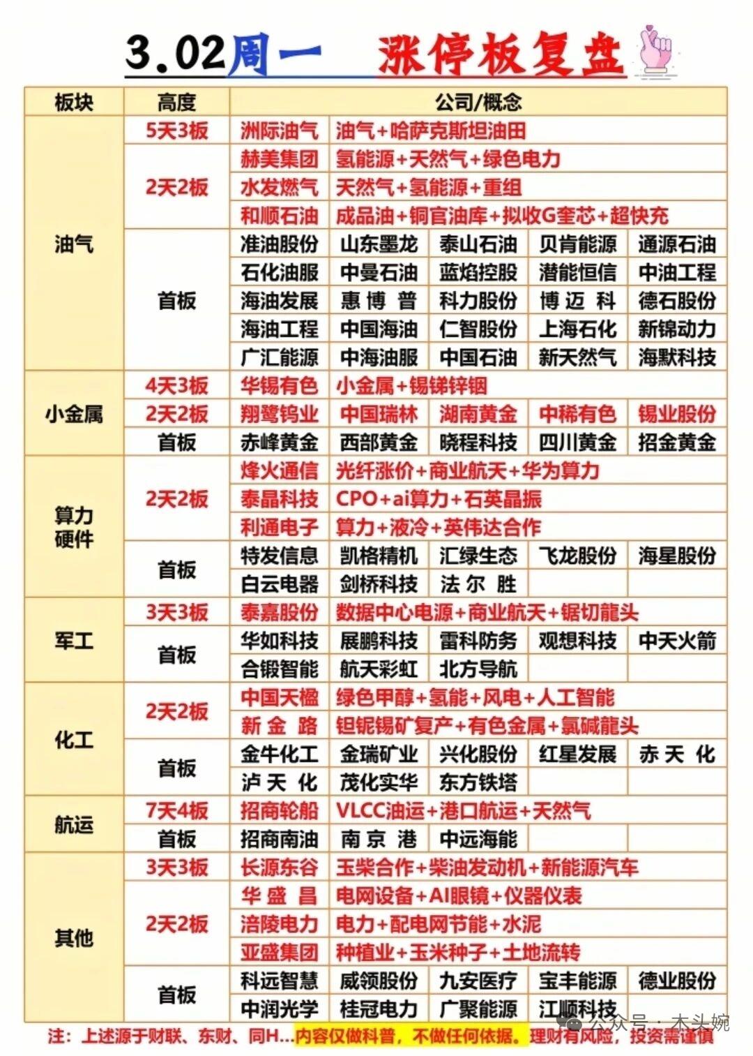 创历史记录,三桶油全部涨停!美伊冲突核心题材石油、黄金、军工、化工全线异动! 3月2日周一复盘整理:美伊冲突引爆大A!两万亿中石油涨停,核心概念全梳理,石油、黄金、军工、化工全线异动!相关概念龙头梳理! 周一受美伊冲突升级、国际油价暴涨催化,中国石油于3月2日A股强势涨停,收报11.95元,创2015年4月以来新高,总市值突破2万亿元,与中国石化、中国海油实现历史首次集体涨停。 3.2市场连板高度榜与主力资金数据出炉!法尔胜、招商轮船领跑连板梯队,光模块、商业航天、贵金属板块获主力重兵布局📊。连板高度与资金流向双维度透视,主线脉络清晰可见,马年交易周的核心节奏已悄然浮现🧧。 ⚠️理财有风险,投资需谨慎。温馨提示:主力资金、游资龙虎榜、暗盘数据等等都不能代表股价趋势,数据仅供参考,谨慎参考不能作为投资依据。