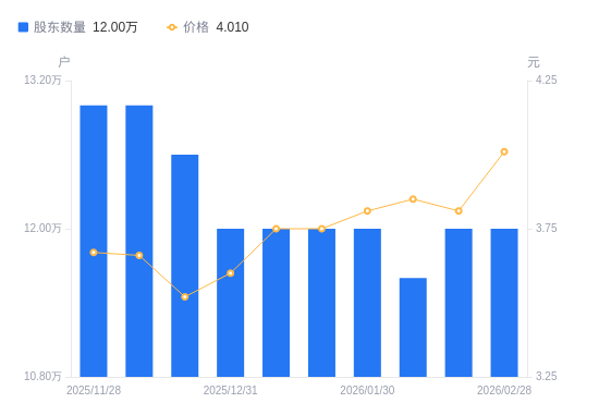 日期A股户数(户)流通A股户均持股数(股)户均持股市值(万元)2026-02-2812000014759.045.922026-02-1312000014759.045.622026-02-1011600015267.975.882026-01-3012000014759.045.622026-01-2012000014759.045.532026-01-0912000014759.045.532025-12-3112000014759.045.312025-12-1912600014056.234.952025-12-1013000013623.734.992025-11-2813000013623.735.00