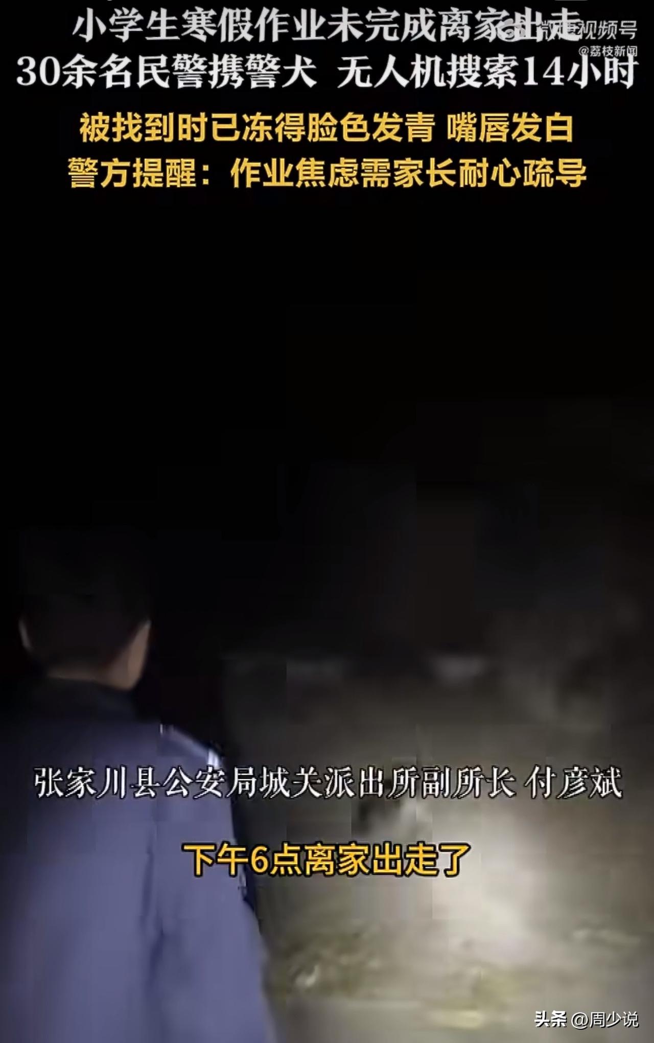 揪心!甘肃姐弟作业没写完寒夜出走,30人搜救14小时,藏在山坳里不敢出声!网友吵翻了! 据媒体报道,2月27日傍晚,张家川县12岁的姐姐和11岁的弟弟,只因寒假作业未完成,害怕被家人责骂,竟悄悄离家出走。据悉,当天当地气温仅有1℃,还飘着冷雨,这样的天气里,两个孩子的安危让人揪心。 接到报警后,当地公安立刻行动,30余名民警带着警犬、无人机连夜展开搜救。整整14个小时,从暮色沉沉找到晨光熹微,终于在28日上午9点多,于一处隐蔽山坳里发现了姐弟俩。小脸冻得发青,嘴唇也没了血色,为了不被找到,他们还特意躲着搜救队伍,想想都让人心疼。万幸的是,送医检查后,孩子并无大碍。 此事一出,网友们也纷纷热议。有网友表示:“孩子怕挨骂的心情能理解,但也太让家长和民警操心了” 也有网友认为:“说到底,还是亲子沟通出了问题,孩子不敢跟家长说心里话”。 这起事件在周少看来,看似是孩子逃避作业,实则是家庭教育里的“情绪隔阂”在作祟。孩子年纪小,面对未完成作业的后果,第一反应不是解决问题,而是选择逃避,这背后,大概率是平时家长的教育方式偏于严厉,让孩子对“犯错”充满恐惧。 说直白点,就是犯错后不被包容的指责、不被理解的压力。他们年纪小,不懂怎么疏导焦虑,只能用最笨拙的方式逃避,哪怕外面又冷又黑,也比回家挨骂安心。 实际上,家庭教育里,从来没有“小事”。作业没写完可以补,知识没学会可以教,可孩子心里的恐惧一旦扎根,亲子间的信任一旦破裂,再想修复就难了。 所以,家长们不妨换个思路:当孩子出现问题时,先放下指责,试着倾听他们的难处。别让本该温暖的家,变成孩子想逃离的地方,毕竟我们要养的,是身心健康的孩子,不是只会完成任务的机器。#寻美三湘# #周少说教育#