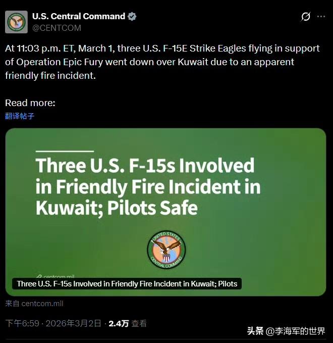 伊朗没说假话,已确认美军3架F-15E被击落。 美国中央司令部正式确认,3架美军F-15E战斗机在科威特上空被友军误击落。 其实谁击落的并不重要,重要的是确实有三架F-15E摔了,这就行了。 3架F-15E战斗机,将近2亿刀没了。 F-15E被击落很正常,这是款老飞机了。 他最早是1990年服役,你算算到今天已36年了,早已老美不堪了,就美国还拿他当宝。 F-15系列最新的是F-15EX,这个型号老美只服役了14架,波音的年产量只有个位数。 还是那句话,一架误击还说得过去,三架被误击,谁信?反正我不信。