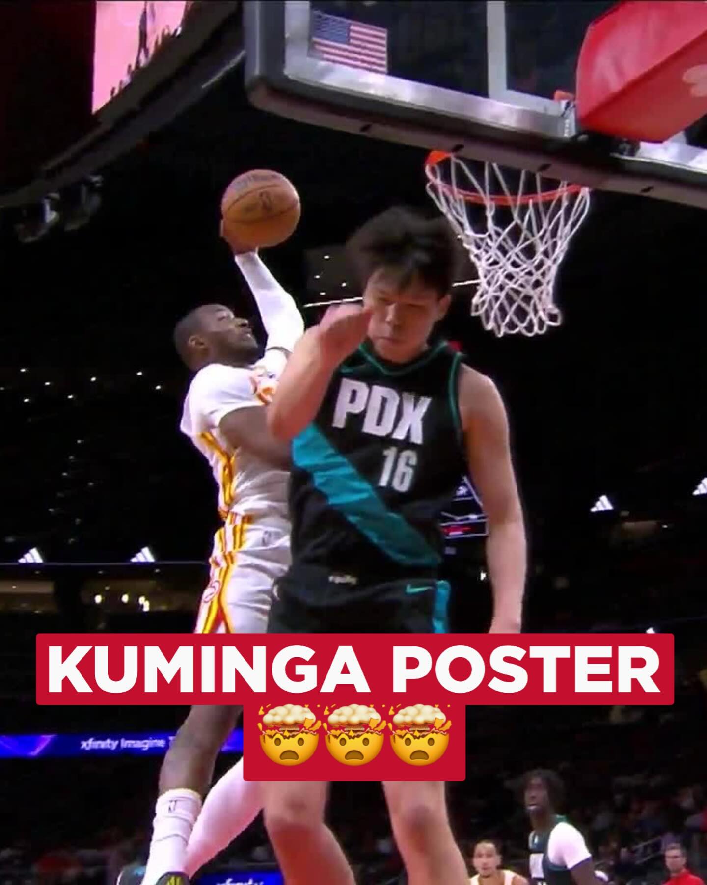 赛后,老鹰官方更新Ins,晒出一张老鹰球员乔纳森-库明加的隔扣照与球迷分享。
