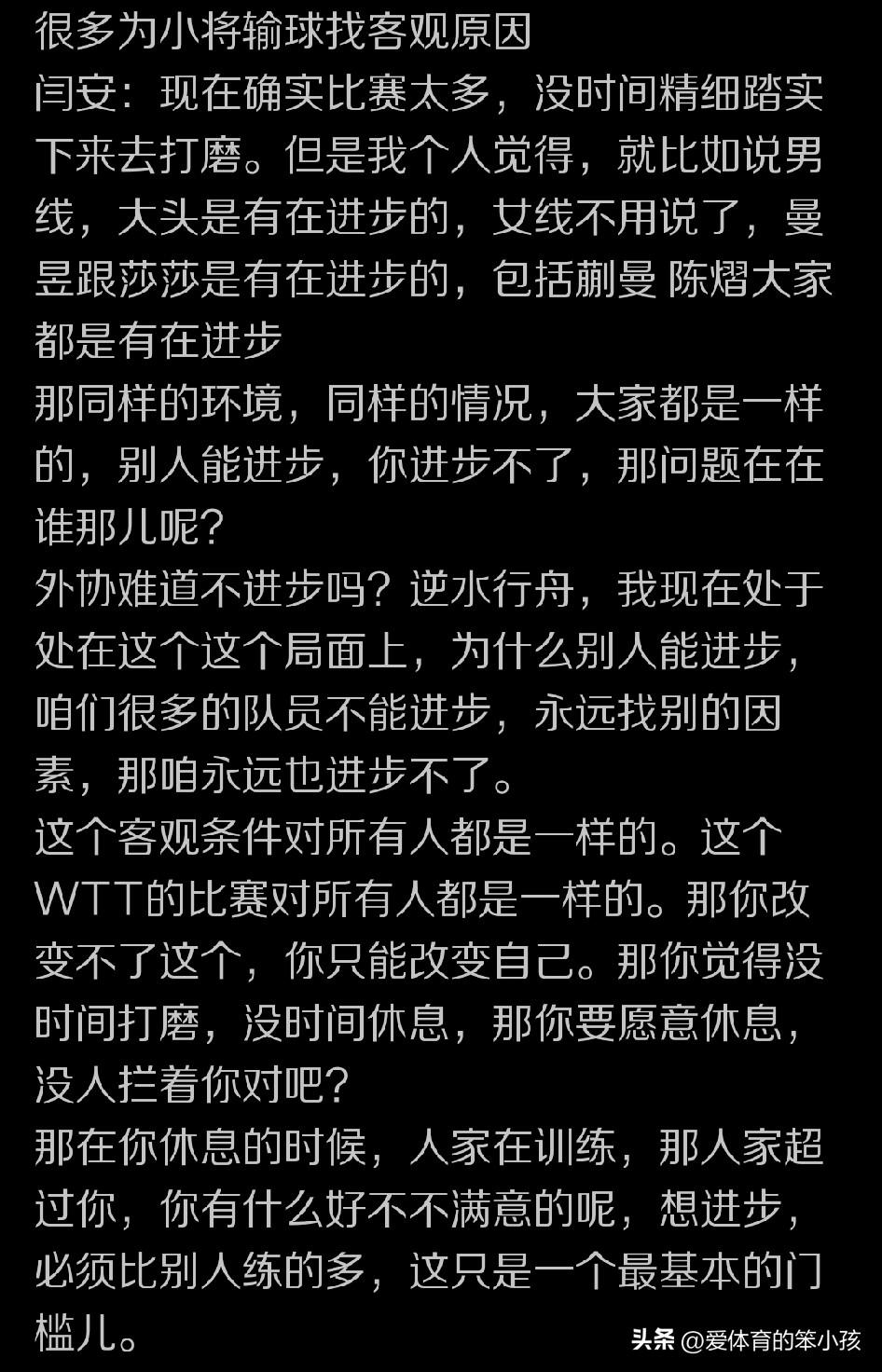 相信很多球迷都注意到了一点,那就是在王楚钦一个人单独进入4强,与其他外协会的高手连续进行两轮强强对话之后,他还是拼下了最后的男单冠军,确实让人非常欣慰。 但其他的男单球员却都在4强战之前就连续止步。也确实让人有些唏嘘,而且对中国男乒目前的整体竞争格局也有一些担心。尤其是世界排名持续稳定在前几位,还拿到过世界排名第一位置的林诗栋,连续很长时间没有单打冠军进账,直接陷入冠军荒,还在外战当中多次输给主要对手,也的确让国乒男队整个教练组都迎来一种困境,而且对整个团队竞争力的形成也产生一些负面影响。 不过,对于林诗栋当下的这种起伏,还有竞争力下滑,其实在球迷包括专业人士当中持两种区别很大的态度,一种就比如像国乒前国手闫安,他认为还是像林诗栋这种年轻球员自己的心态出现问题。其他队友都能在困境当中。不断调整自己,并在遇到困难之后实现成功摆脱,证明即使比赛打的频次比较多,大家都比较疲劳,但是还是可以在这种比较困难的情况下不断突破自我,让竞争力有明显提升的——比如女队的陈熠在这次的新加坡大满贯赛上就终于突破了日本削球名将桥本帆乃香这一关,而且还是零封对手,可见她的这种连续输给对手之后的进步是实际存在的,她的努力也获得了赛场上的回报以及赛场外的认可。 而作为林诗栋来讲,也许需要一些休息调整时间,但更多的还是要在实战当中不断突破自我,找准方向和目标,比如在菲利克斯勒布伦这种主要外协会的竞争对手面前,要全力争胜,并要把一些不足和暴露出来的问题尽快解决掉。 而另外一种球迷和媒体人则对林诗栋继续持认可的态度,毕竟之前的国乒男队主力层当中的年轻主力或者说潜在的重点培养对象,往往是被老大哥带着打的,比如最早的樊振东,前面还有马龙、张继科、许昕,后来王楚钦前面也有马龙和樊振东,当下的林诗栋则经常要和王楚钦一起挑大梁。王楚钦也有偶尔失手走不到最后的时候,有时候林诗栋还要自己去当一哥,这对林诗栋的压力就显得更大。 所以我们在对林诗栋提出更高要求和期待的同时,也确实需要给予他一定的理解。即使他当下处于低谷,外战当中稳定性下降而且在世界赛场上难求一冠。但是我们依然不能总是去批评指责他,也不能直接说他上限不高,早早给他下结论,而是需要用一种鼓励的态度来帮助他找准自己需要努力的方向和目标,以争取前进的路上少走弯路,并全力突破自己。 樊振东、王楚钦,包括更早的马龙也都有过这样的低谷期。林诗栋有这种情况,我们现在也要有耐心见证他复苏和成长。即使能让这种低谷期的时间稍微短一点也是一种成功。也让我们给予林诗栋更多的支持和关注,包括送上鼓励的掌声。也希望林诗栋的下一个高光时期早点到来。