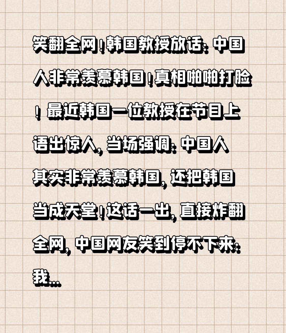 笑翻全网!韩国教授放话:中国人非常羡慕韩国!真相啪啪打脸! 最近韩国一位教授在节目上语出惊人,当场强调:中国人其实非常羡慕韩国,还把韩国当成天堂! 这话一出,直接炸翻全网,中国网友笑到停不下来:我们羡慕啥?羡慕泡菜贵、水果天价、还是羡慕你们活在韩剧滤镜里? 这位教授还自信满满,说韩国是文化、军事、体育全方位强国,加个“K”就风靡全球,中国人都在偷偷仰望。 很多人被带节奏,真以为我们还在追十几年前的韩流,觉得国外月亮比较圆。 但现实直接反转,打脸来得太快! 现在早不是我们羡慕韩国,而是大批韩国人抢着来中国发展。首尔街头全是中文招牌,中国高铁、移动支付、新能源汽车让他们惊叹;汉服、国产剧、国货在韩国疯狂圈粉,不少韩国网友坦言:现在的中国,才更让人向往。 我们喜欢看韩剧、听K‑pop,只是欣赏娱乐文化,跟“羡慕国家”完全是两码事。 中国有辽阔国土、五千年底蕴、安稳治安、便利生活,物价亲民、美食遍地,我们日子过得踏实舒服,根本没必要去羡慕谁。 真正的自信,从来不是靠脑补别人的仰望,而是靠实力说话。 中国年轻人的目标是星辰大海、是科技巅峰、是民族复兴,我们忙着变强,根本没空去攀比。 这位教授与其活在幻想里,不如多看看真实世界。 尊重事实、平等交流,才是长久之道。我们不贬低任何国家,也绝不接受被强行“羡慕”! 为我们的大国底气点赞,为生在华夏感到骄傲与安心!
