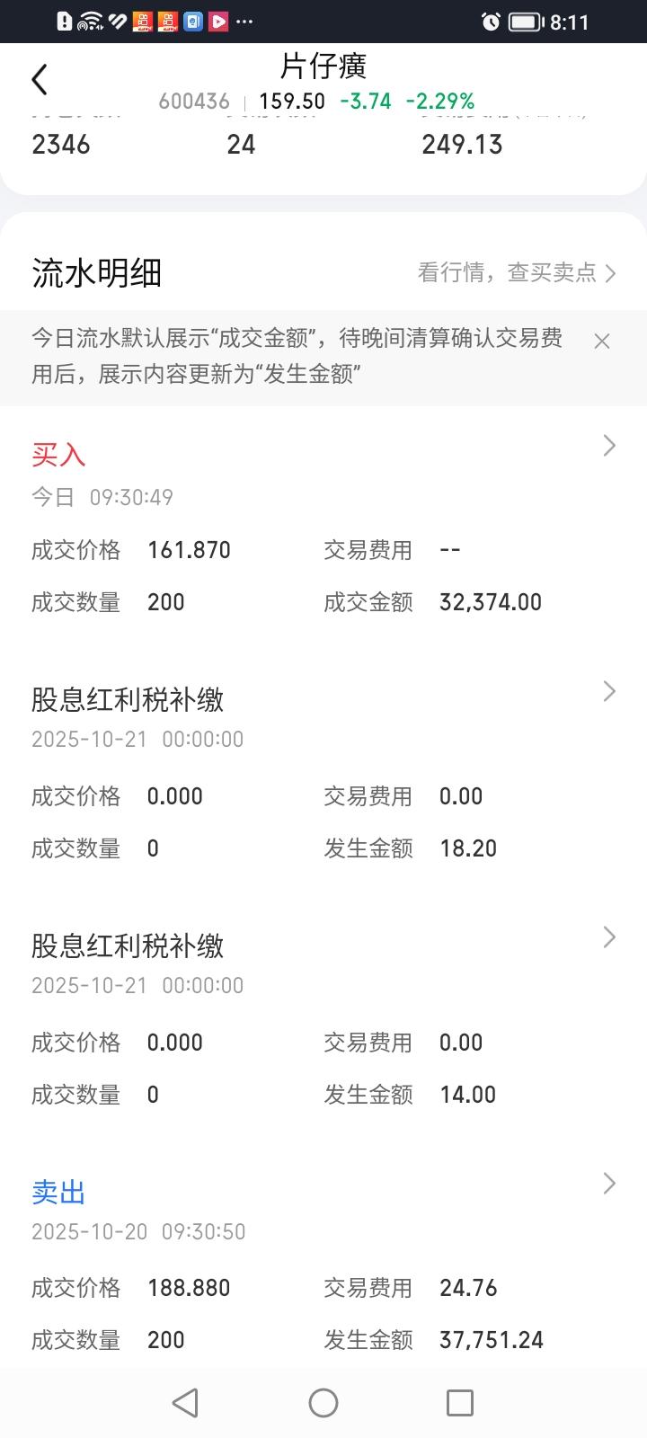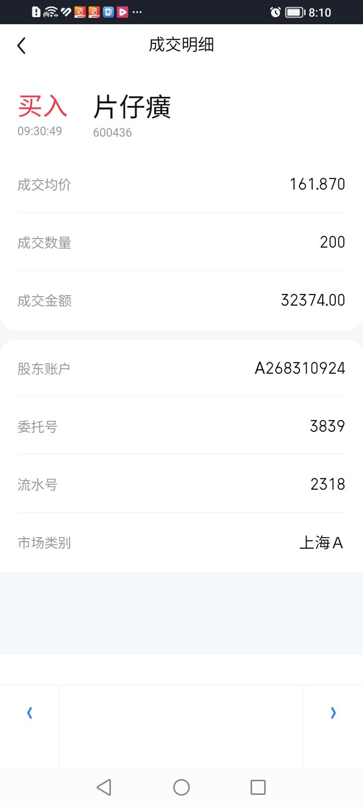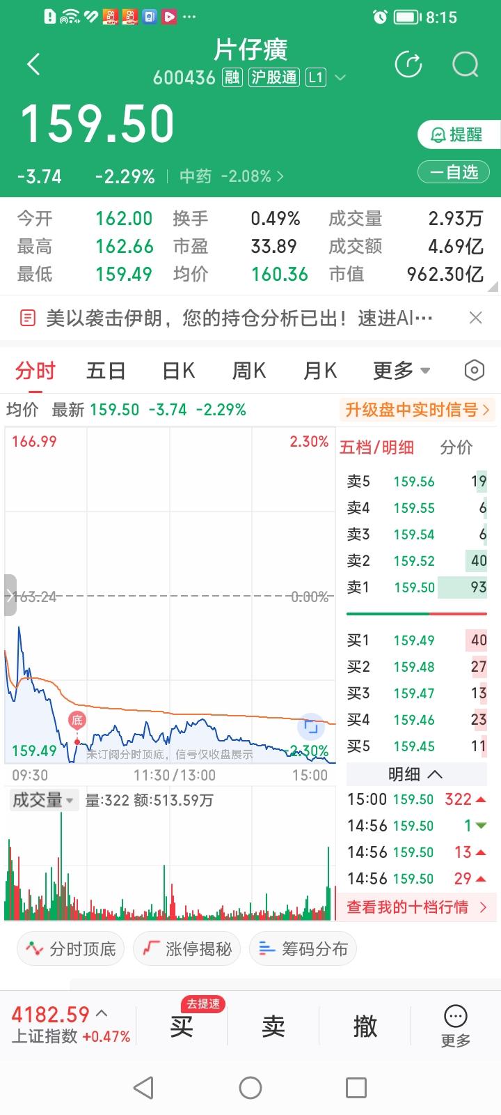 完犊子了!今天抄底片在癀挂单价过高被套了! 今天一开盘见片仔癀低开了1.24元 ,幅度0.76%,认为低开得不少了,就急吼吼的挂了个161.87元的买单买入了片仔癀。没想到买完后它一路下跌,收盘价159.50元,咱又成功被套啦! 从定性上看,片仔癀的垄断性、稀缺性、成长性自不待言。从定量上看,主要药材天然牛黄价格暴跌导致药材成本降低,大股东贷款增持、消费复苏等利好因素加持。片仔癀利润在今年三季度重回增长轨道是大概率事件。 物以稀为贵,贱取如珠玉。片仔癀在150——160元左右构筑双底的可能性不小。咱已经持有片仔癀2346天了,不在乎再持有2346天,片仔癀会给我惊喜还是惊吓呢?