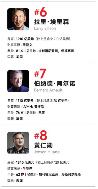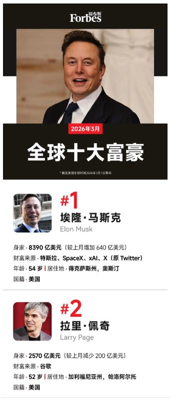 马斯克是本月最大赢家,过去一个月财富增加了640亿美元(自年初以来增加超1000亿美元),再度刷新财富纪录。2025年10月,他成为全球首位身家达5000亿美元的人,12月又接连突破6000亿、7000亿美元大关。2026年2月,其身家首次突破8000亿美元,截至美国东部时间3月1日零点估计达8390亿美元。他与第二名、谷歌联合创始人拉里·佩奇(LarryPage)的财富差距已超过5000亿美元;佩奇2月财富缩水200亿美元,目前身家约2570亿美元。