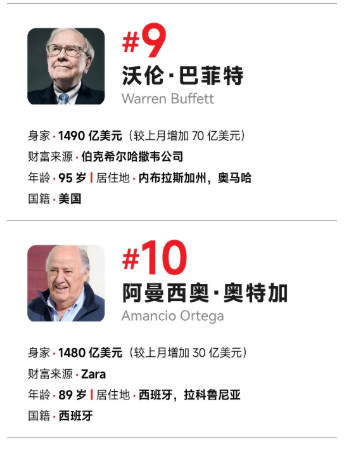 经历1月的动荡行情后,全球十大富豪的排名在上月基本保持稳定,仅两人位次互换:沃伦·巴菲特(WarrenBuffett)升至第9位,Zara联合创始人阿曼西奥·奥特加(AmancioOrtega)降至第10位。