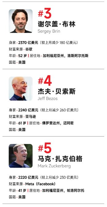 佩奇已连续第四个月稳居全球富豪榜第二位。2月,随着Alphabet、亚马逊(Amazon)、Meta、甲骨文(Oracle)股价下跌,包括佩奇在内的五位跻身全球前十的美国科技巨头,财富均缩水超过200亿美元。杰夫·贝索斯(JeffBezos)当月损失最为惨重:亚马逊股价下跌12%,使其身家减少260亿美元,降至2240亿美元。