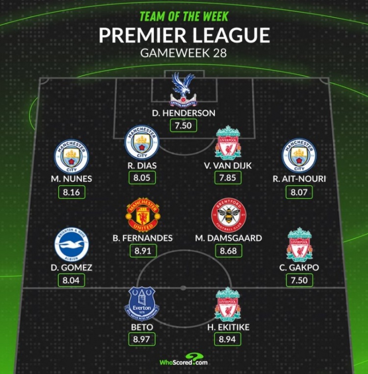 中场:戈麦斯(布莱顿)、B费(曼联)、达姆斯高(布伦特福德)、加克波(利物浦)
