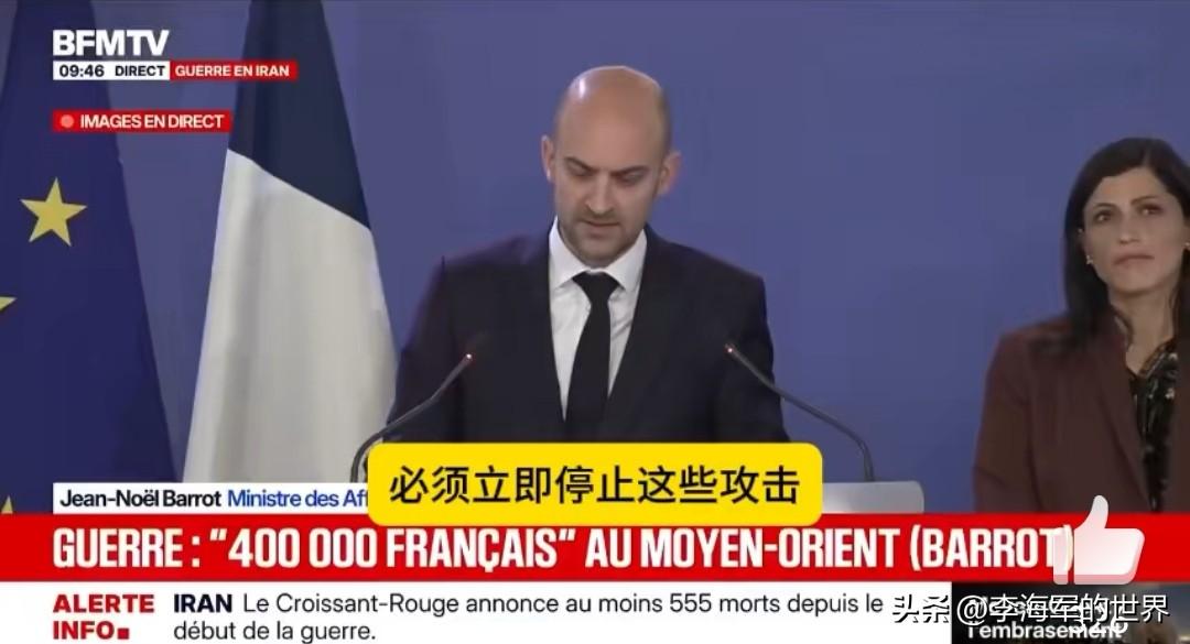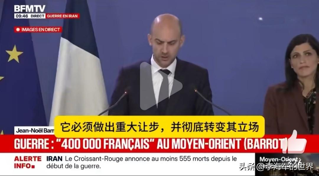 法国外长:伊朗必须做出让步,停止攻击行为。 法国外交部长让-诺埃尔·巴罗表示:“军事对抗升级必须停止,伊朗政权如今已丧失领导人,必须停止攻击行为。它必须同意做出重大让步并彻底改变立场,才能找到政治解决方案。” 德国总理,指责伊朗不应该反击。 法国外长,伊朗必须做出让步,停止攻击。 明明是美国和以色列发动的对伊朗攻击,他俩不让美国以色列停止攻击,而是要伊朗停止攻击,要伊朗做出让步。 明明是凶手拿刀伤害路人,他不指责凶手,反而说路人有错,你要停止反抗,做出让步。 不愧名字带个“让”,句句不离让步! 瞧瞧,这就是他们嘴里的国际准则! 只许他打你,不许你反抗。 你反抗就是破坏国际准则,破坏地区稳定。 在他们眼里,打人是正义,反抗是违法。