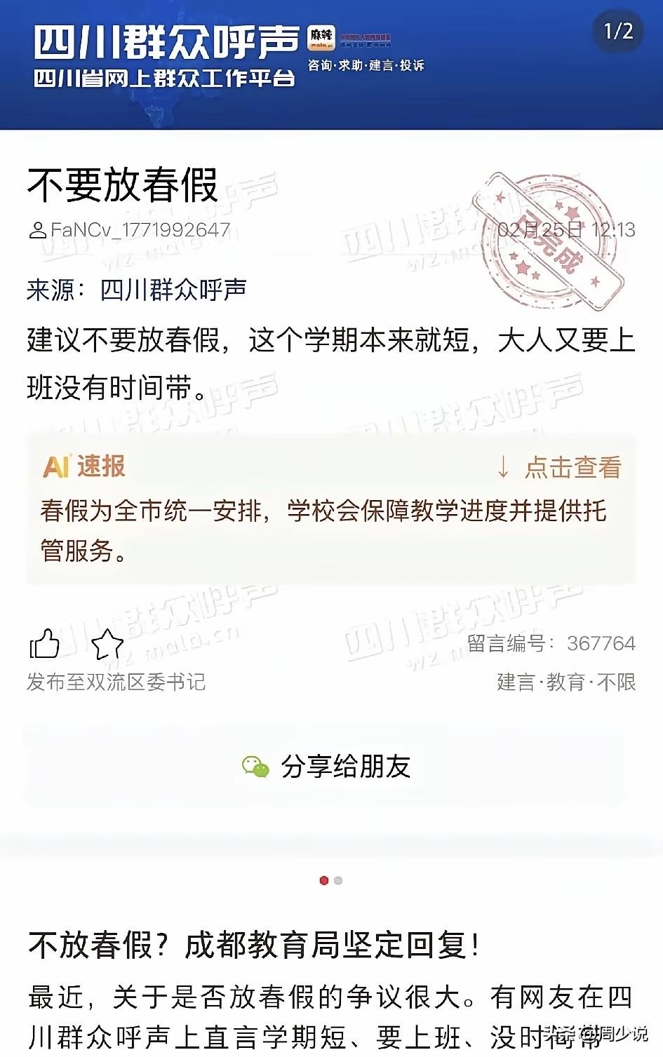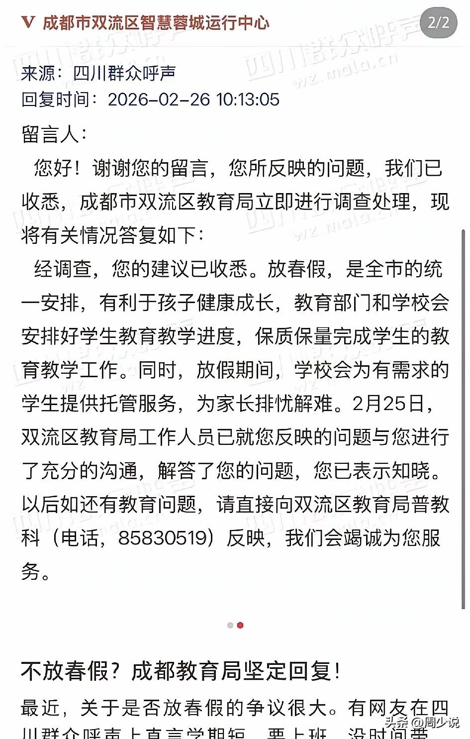 “成都家长圈彻底炸锅!”近日,一位家长在四川政务平台留言,直言春假让双职工家庭犯难,夫妻都要上班,老人不在身边,孩子独自在家不放心,送校外托管又费钱又费心,孩子放假无人看管,建议不要放春假! 此事在网上传开后,瞬间引发全城家长共鸣,网友们也吵成一片。有人说“政策暖心,但落地难,双职工真的扛不住”。 也有人觉得:“春假能让孩子放松,不该一刀切取消”。 很快,双流区教育局给出明确答复:春假是全市统一安排,初衷是助力孩子身心健康成长,学校会统筹教学进度,基本不会耽误正常学习。 更贴心的是,针对家长最头疼的带娃问题,官方明确春假期间学校将提供托管服务,有需求的家庭都能申请,目前已和留言家长沟通到位,对方也表示理解。 其实这件事,周少觉得说到底是教育政策与家庭现实的温柔碰撞。春假的设计,本是想跳出书本,给孩子一段亲近自然、调整状态的时间,契合素质教育的初衷,可偏偏撞上了双职工家庭的看护短板,难免让人纠结。 其次,官方没有简单否定家长的诉求,而是用托管服务兜底,既守住了教育的初心,也接住了家庭的难处。教育从来不是单向的安排,而是学校、家庭、社会互相适配的过程,春假如此,其他教育政策亦是如此。 实际上,这争议背后,是大家对优质教育、省心育儿的共同期待。比起简单取消或强行推行,慢慢完善配套、兼顾不同家庭的情况,这才是更稳妥的方式。 毕竟,好的教育政策,既要顾及孩子的成长,也要体谅家长的不易,在理想与现实之间找到平衡点,才能让每一项安排都真正温暖人心。 对于这位家长留言建议不要放春假,大家是支持还是反对呢?#寻美三湘# #周少说教育#
