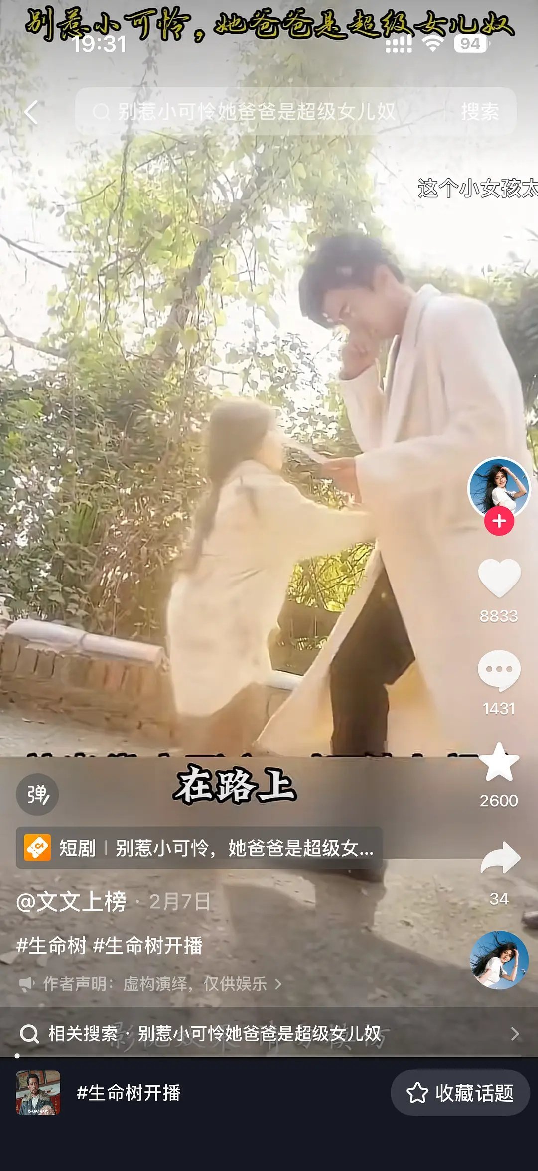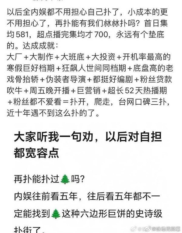 说实话,今年有杨紫这部生命树垫底,其他明星的剧播成什么样都可以吹。因为再扑也比生命树强,像生命树这种大厂大制作却血扑成这样的,真的太少见了。另外这剧抖音播放量也是造假的!