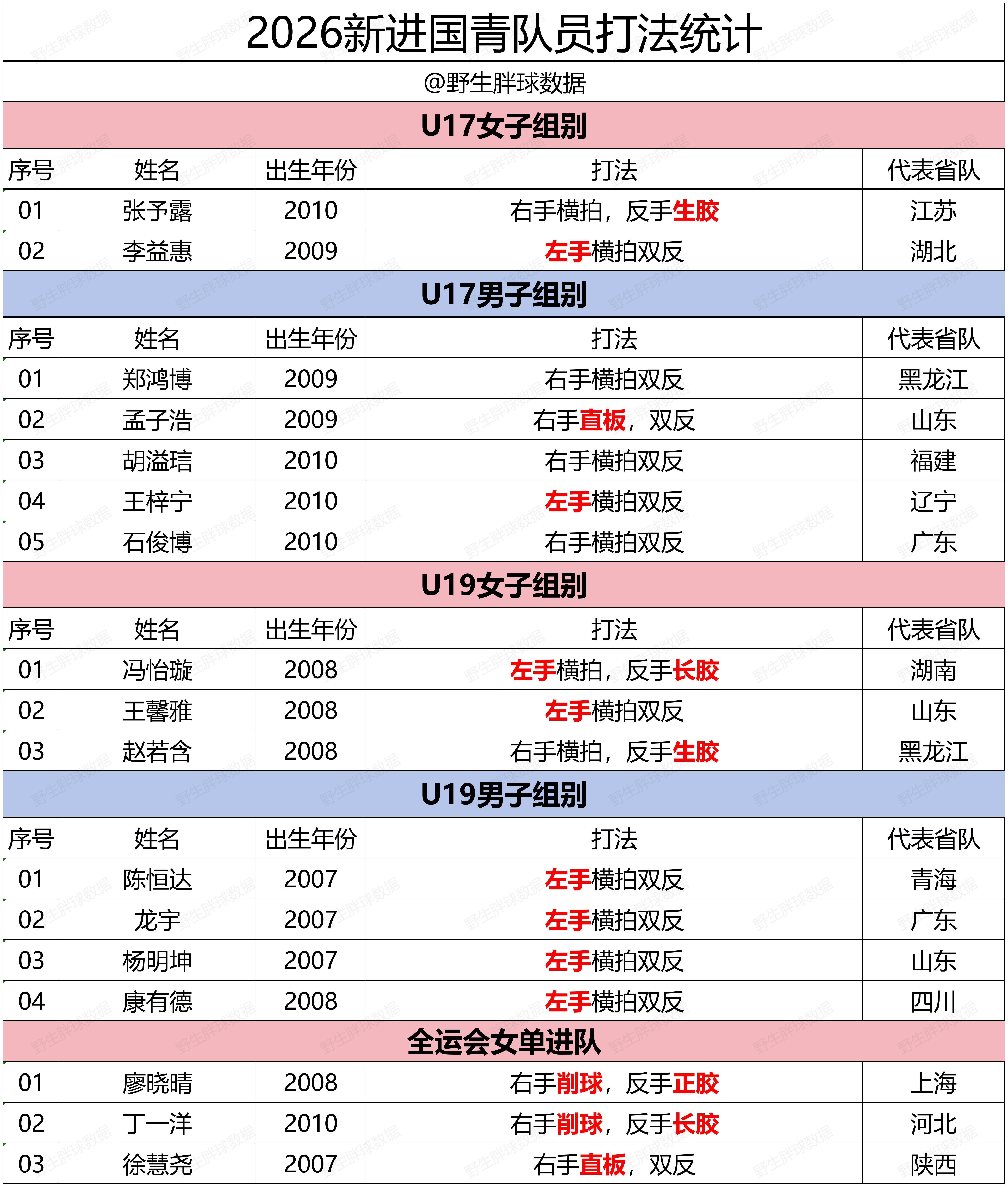 2026年国家青年队新入队人员&打法名单表格正经新鲜血液,国乒梯队