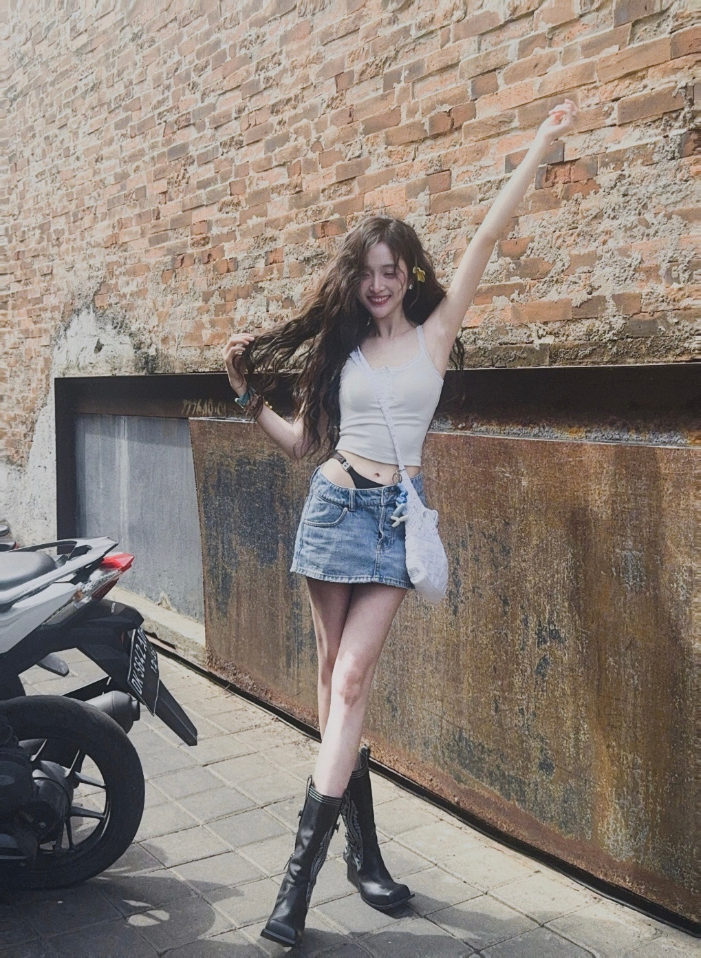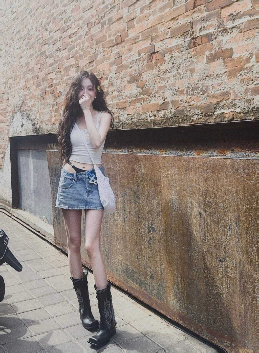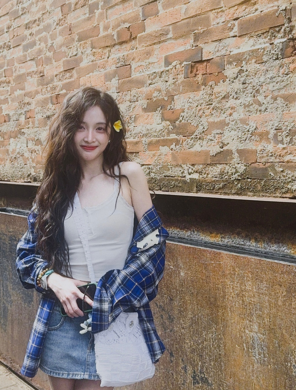 吴宣仪甜美私服,背心牛仔短裙,青春感十足。吴宣仪