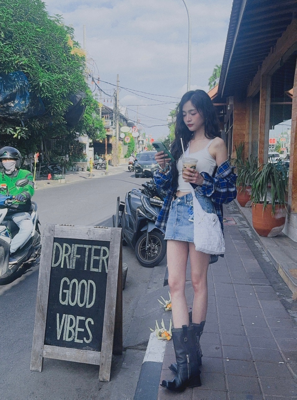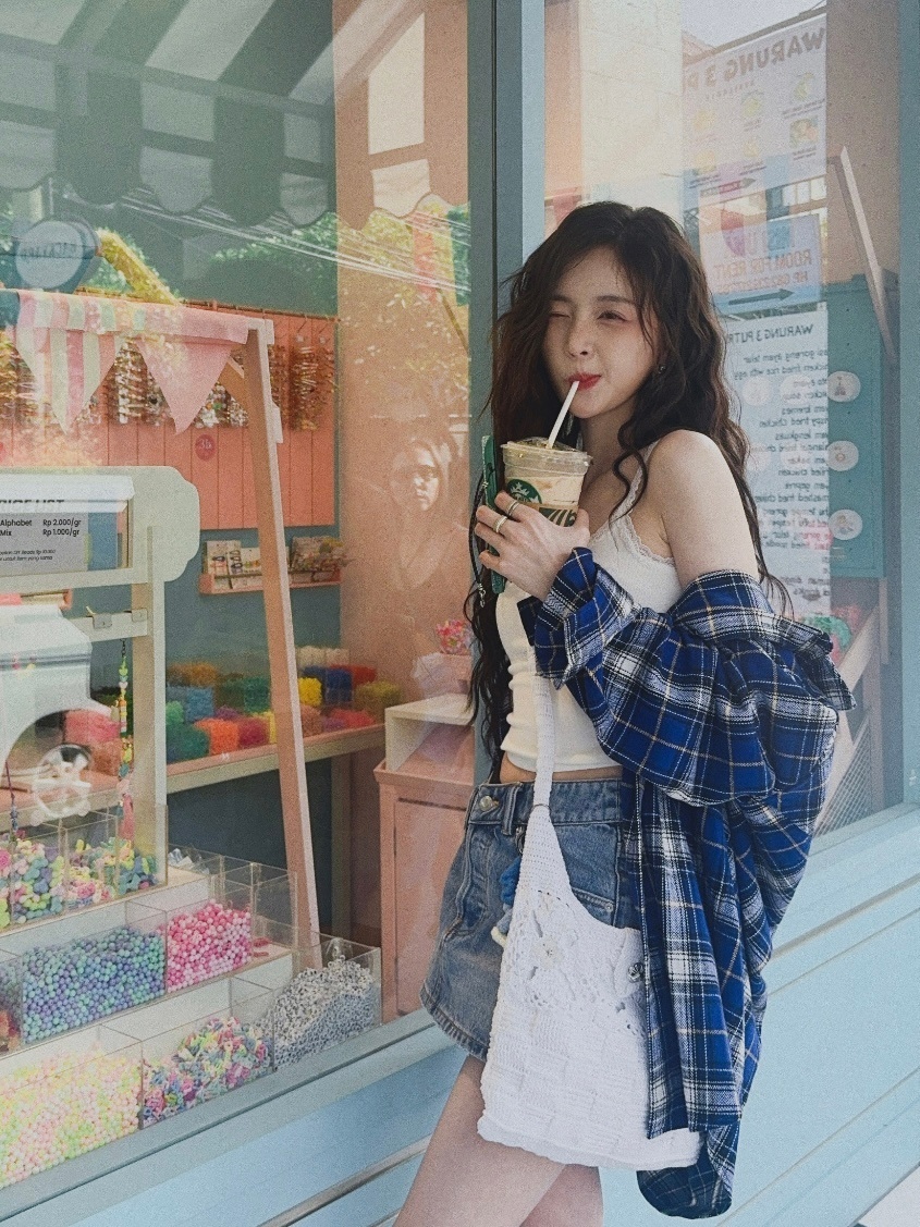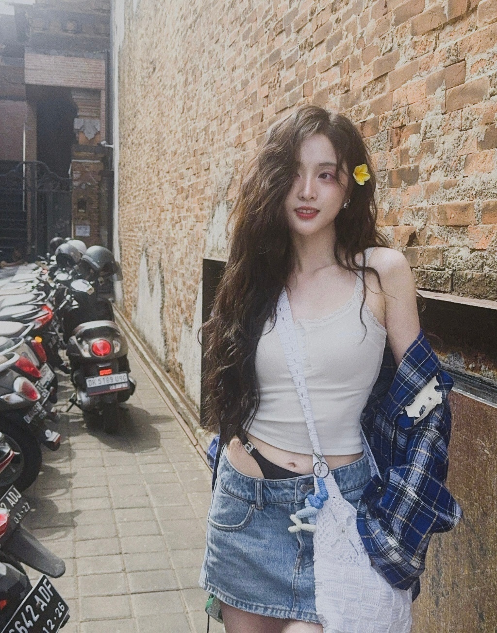 吴宣仪甜美私服,背心牛仔短裙,青春感十足。吴宣仪