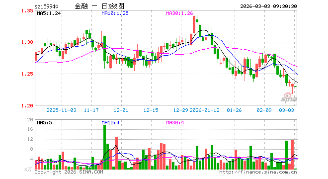 3月3日,金融地产ETF(159940)开盘跌0.24%,报1.230元。金融地产ETF(159940)重仓股方面,中国平安开盘涨0.16%,招商银行跌0.03%,兴业银行涨0.05%,东方财富跌0.09%,中信证券跌0.04%,工商银行跌0.14%,国泰海通跌0.05%,农业银行跌0.31%,交通银行涨0.15%,浦发银行跌0.21%。