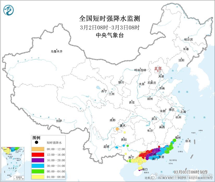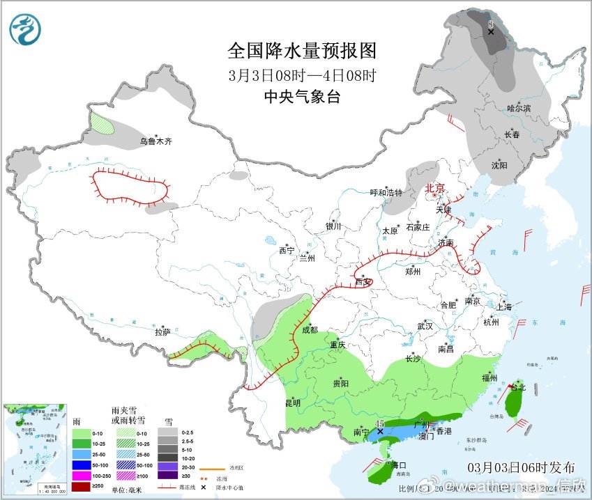 3月3日08时至4日08时,内蒙古东部、东北地区大部、华北北部、新疆北疆北部和伊犁河谷、川西高原西部等地部分地区有小雪或雨夹雪,其中,内蒙古东北部、黑龙江西北部等地部分地区有中到大雪(5~8毫米)。江南南部、华南及四川中南部、云南东部、贵州大部、海南岛、台湾岛等地部分地区有小到中雨,其中,广西东南部、广东中南部等地部分地区有大雨(25~45毫米),可能还会伴随短时强降雨。