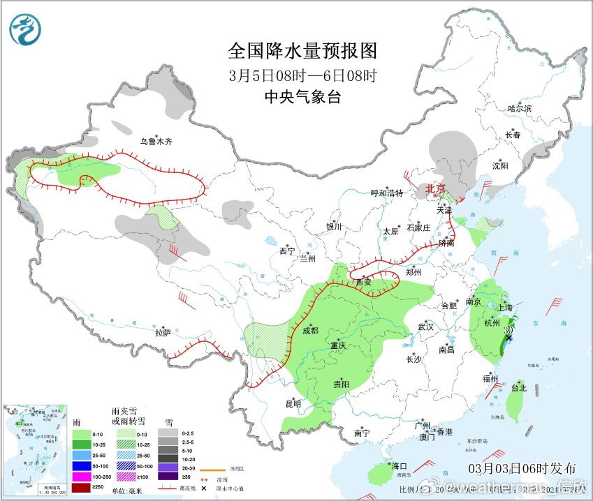 3月5日08时至6日08时,内蒙古东南部、吉林东部、辽宁南部和西部、华北北部、新疆北部和南疆西部山区、西藏北部、青海西部、川西高原南部、山东半岛东部等地部分地区有小雪或雨夹雪,其中,新疆北疆北部和南疆西部山区等地部分地区有中雪。甘肃东南部、陕西南部、四川中东部、云南东部、贵州大部、重庆、湖南西北部、湖北西部、河南南部、安徽东南部、江苏南部、上海、浙江、海南岛、台湾岛等地部分地区有小雨,其中,浙江中东部等地部分地区有中到大雨(25~30毫米)。
