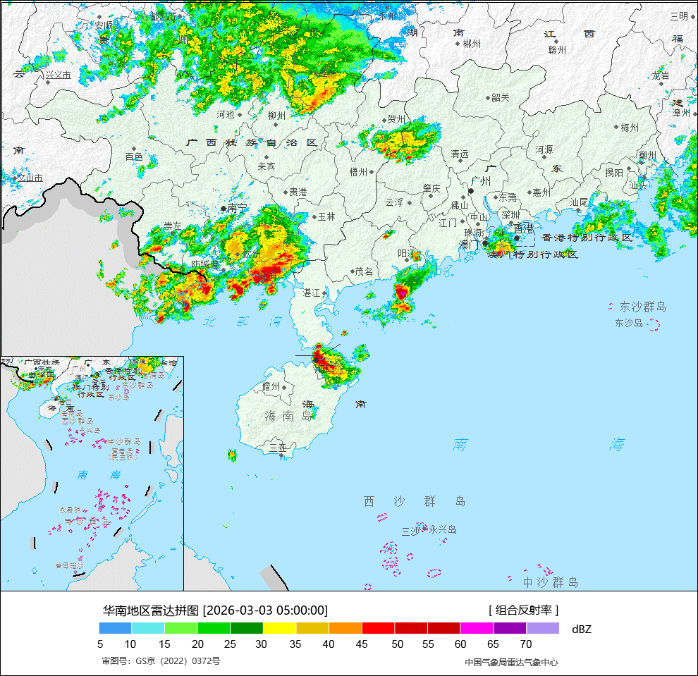 【雨雪】昨天到今晨,降雨向南收缩,但在华南雨势猛烈。广东紫金、花都、东莞、揭阳、从化、河源、南澳、郁南,广西东兴、防城出现暴雨。并且伴随短时强降雨。从图2看,华南的对流可以分为两段,中午从广西东部、广东西部发展起来逐渐容易,夜间推进到福建南部,今天凌晨在广西南部、海南北部、广东西南部又起来一波对流(图3)。