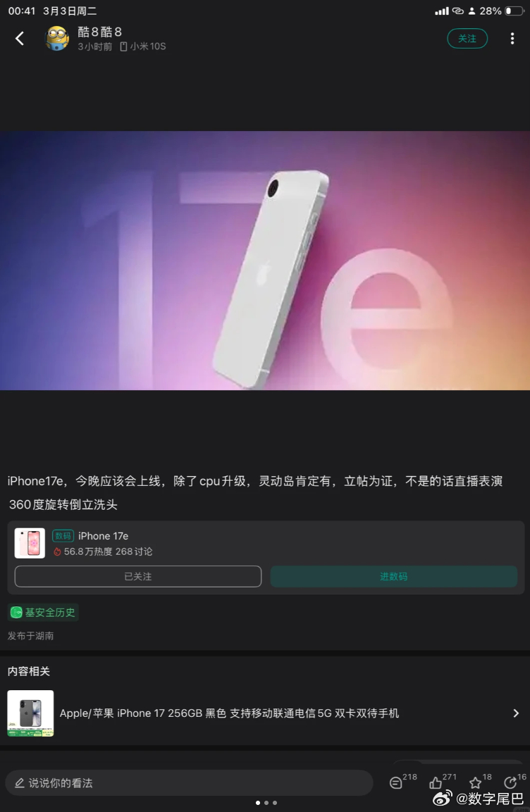 笑拉了 酷安网友笃定今年 iPhone 17e 有灵动岛不然倒立洗头,结果 i