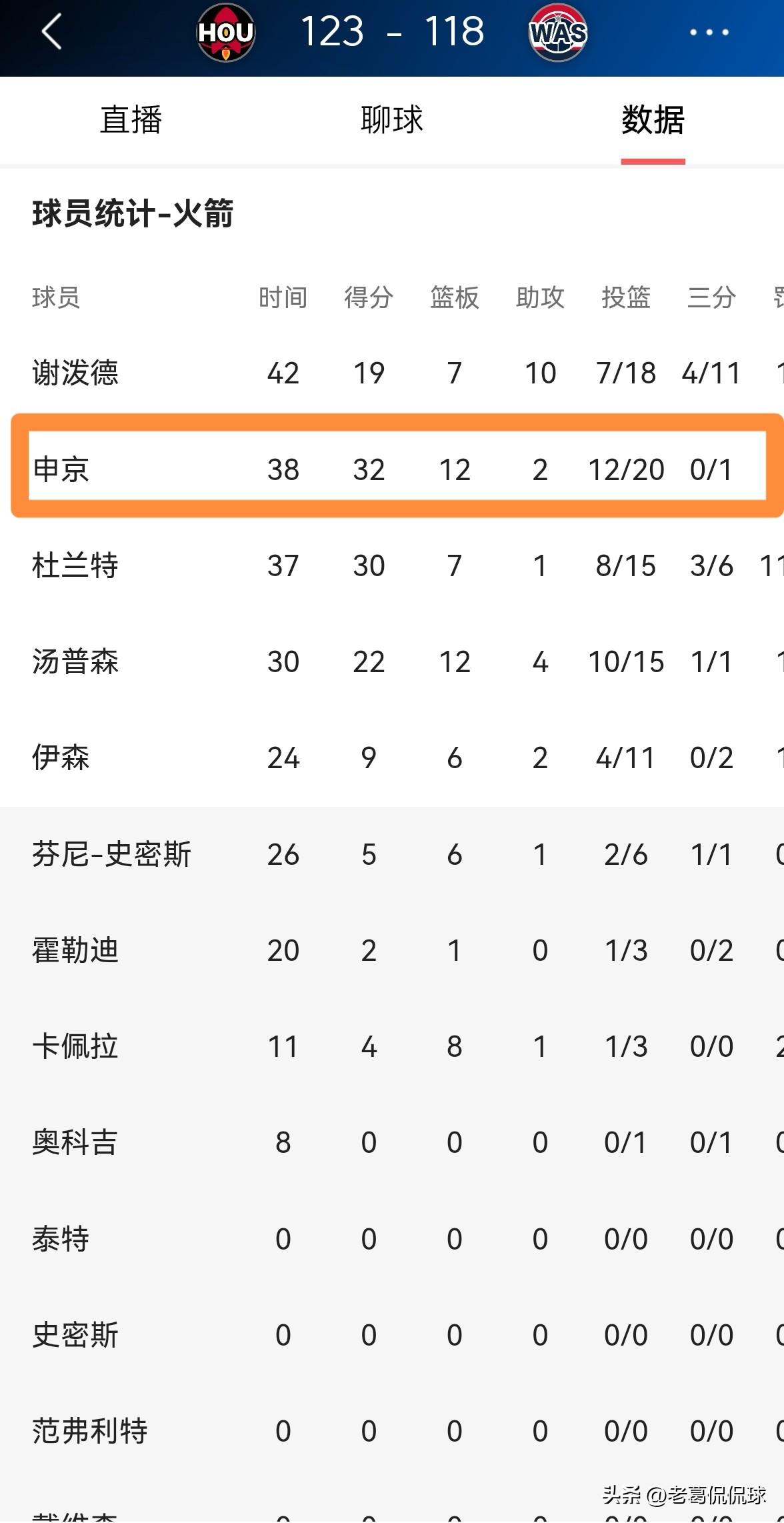 火箭超级球星申京虐菜的本领真是太强了!在今天火箭客场以123:118击败奇才的比赛中,申京在篮下得吃得喝,疯狂肆虐奇才的内线。 整场比赛下来,申京首发出战38分钟,投篮20中12,其中三分球1中0、罚球11中8爆砍32分,还有12篮板2助攻1抢断1盖帽,不过有8次失误,他的场上正负值为-4。 虽然本场比赛申京出现了不可思议的8次失误,但是申京的表现依然非常出彩,事实再次证明,当火箭面对内线实力比较薄弱的球队时,申京完全可以打出统治力。