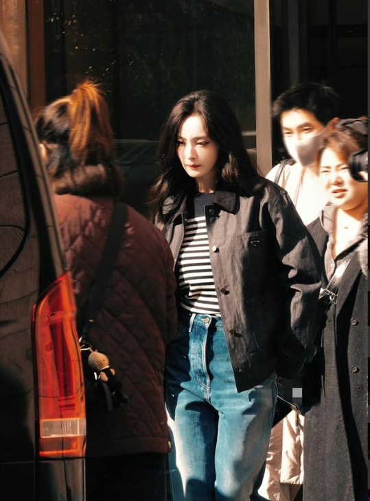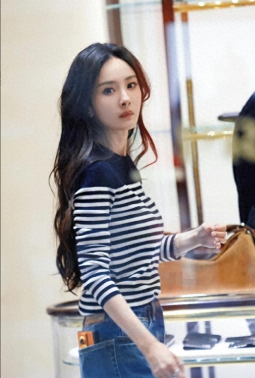 杨幂米兰探店,条纹上衣加牛仔裤,青春有范,实力演绎普拉达女王