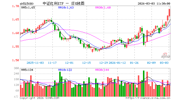3月3日,截止午间收盘,中证红利ETF(515080)涨1.44%,报1.687元,成交额2.10亿元。中证红利ETF(515080)重仓股方面,中远海控截止午盘涨6.09%,广汇能源涨10.05%,中谷物流涨1.99%,山煤国际跌0.25%,平煤股份涨0.56%,潞安环能涨1.75%,鄂尔多斯跌0.57%,山西焦煤涨1.62%,陕西煤业涨1.53%,西部矿业跌3.97%。